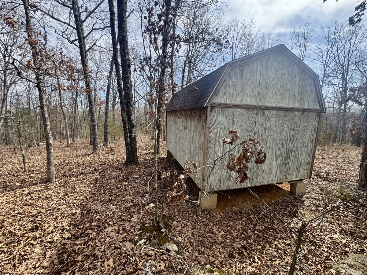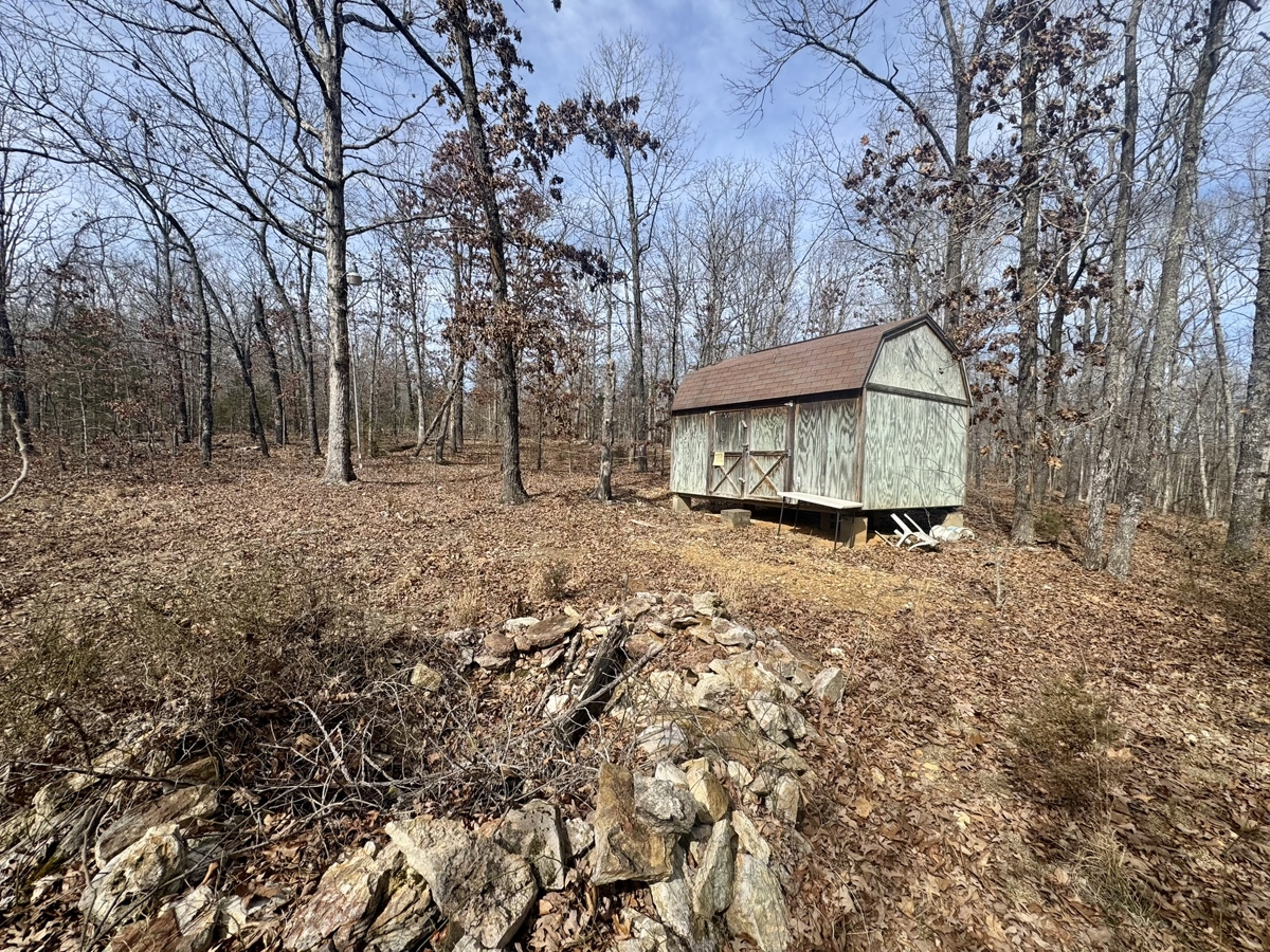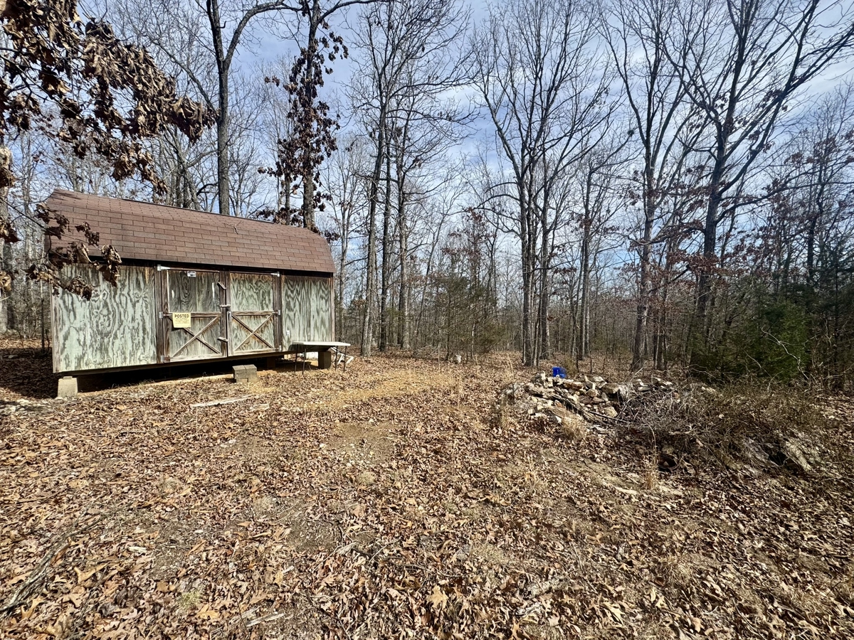 The land includes a 12×16 portable building that can be used for storage, a small hunting cabin setup, or a base camp while you develop the property. A native stone fire pit adds a rustic gathering spot for cooking out, relaxing after a day in the woods, or enjoying evenings under the stars.