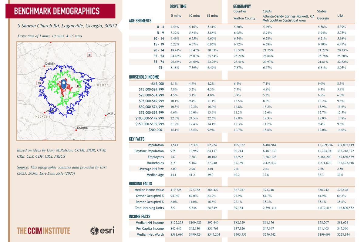 A Versatile 41+ Acre Tract Suited for Church Campus, Retreat, or Long-Term Development OpportunityMarketing descriptionThis 41.61-acre tract in Walton County offers a rare opportunity to secure a large, private landholding in Metro Atlanta’s growth path. Located minutes from Loganville and within easy reach of Atlanta, the property combines accessibility with a peaceful setting.Featuring gently rolling topography and approximately 27.76 acres of usable land outside the floodplain, the site provides strong development potential along with natural buffers and green space.Zoned R-1, the property is well-suited for a church campus, retreat center, or future residential development.Surrounded by growing residential communities, this property offers flexibility, scale, and long-term upside for both users and investors.Investment highlights41.61 Acres in a Growth CorridorLarge tract positioned in Walton County within Metro Atlanta’s expanding development path.Flexible Use PotentialIdeal for church campus, retreat center, or future residential development.Strong Buildable AreaApproximately 27.76 acres outside the floodplain provides primary usable land.Utilities AvailableAccess to county water and electricity, supporting future development feasibility.