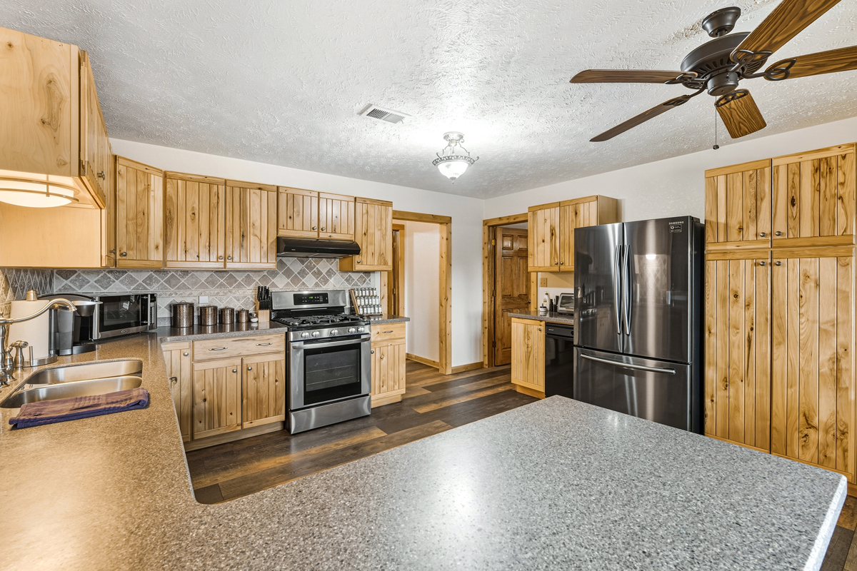 The open-concept main living area flows into the kitchen with Corian countertops, breakfast bar, eat-in space, and updated appliances. High ceilings and double-pane windows allow natural light to fill the space while framing spectacular mountain views.
