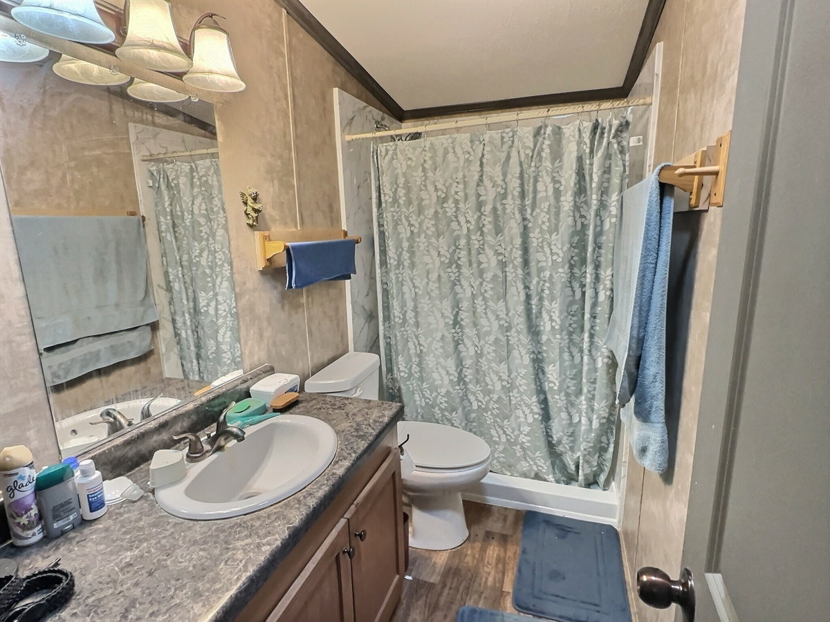 The hall bathroom includes a single vanity and step-in shower, serving the additional bedrooms with ease.