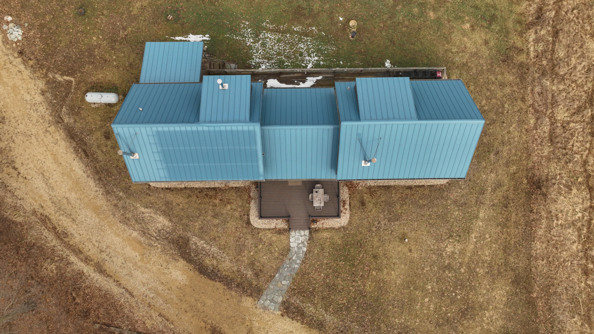 exterior assemblies, standing seam steel roof, Pella double-pane windows, and