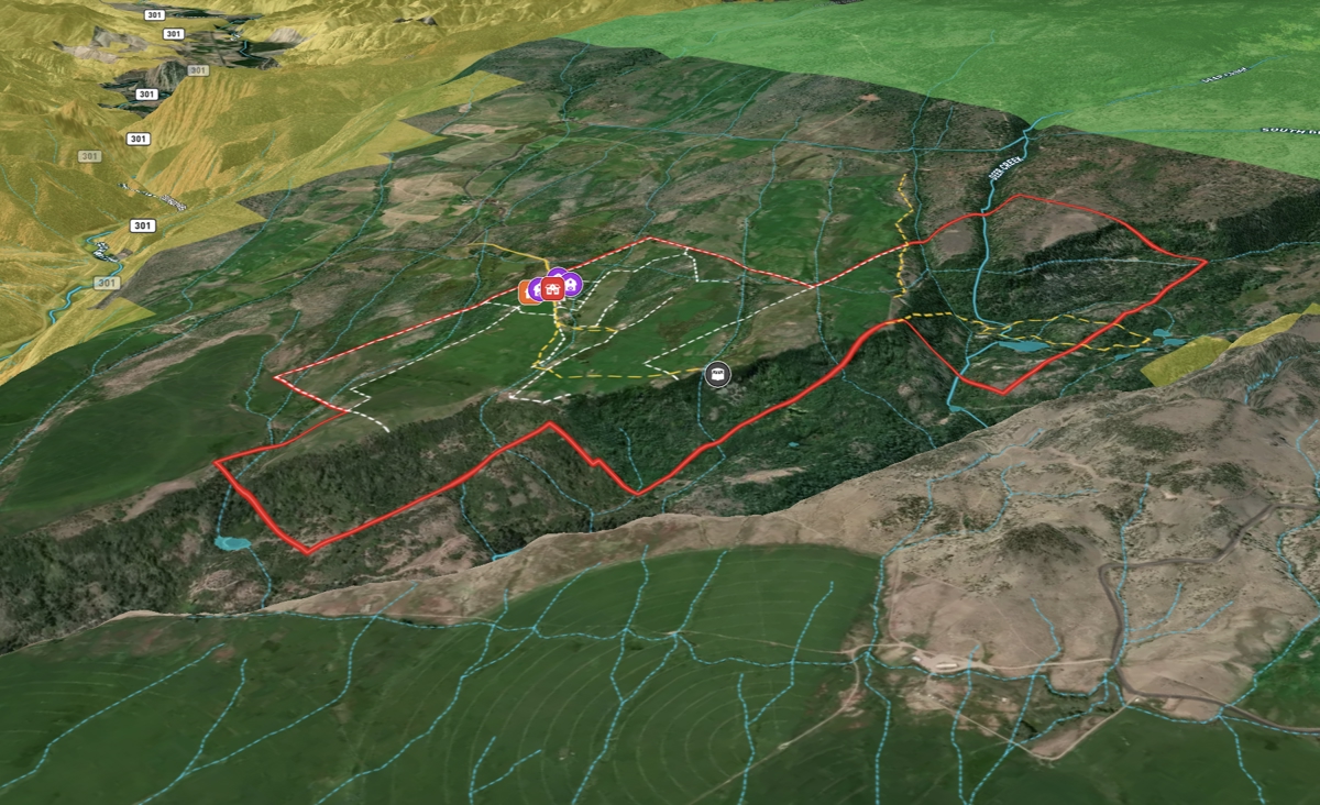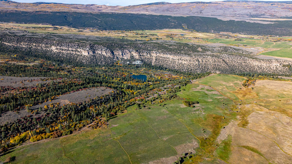The Gates Ranch has a wonderful combination of assets that make it a truly pleasurable place to be. The ranch covers 744 acres, of which approximately 340 acres are irrigated hay meadows that produce about 250 tons of hay annually. It has a good set of improvements, including a modest but cozy log ranch home and a charming historic log bunkhouse that can sleep 12. The ranch is capable of supporting about 100 head of cattle year-round. The north side of the ranch gives way to a rimrock canyon that drops precipitously into Derby Creek, which is a free-flowing Colorado mountain trout stream.