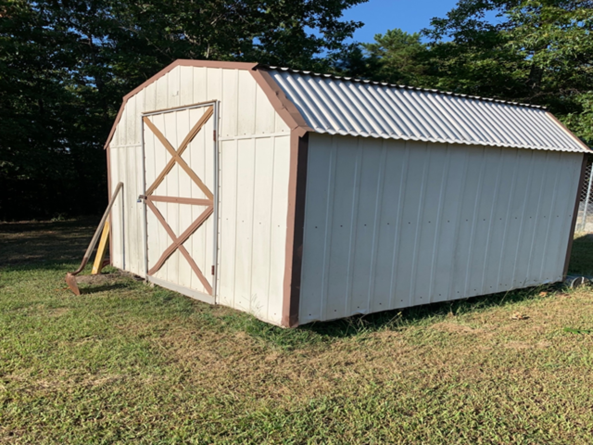 are two storage buildings, a metal barn, a wooden barn, a chicken house with