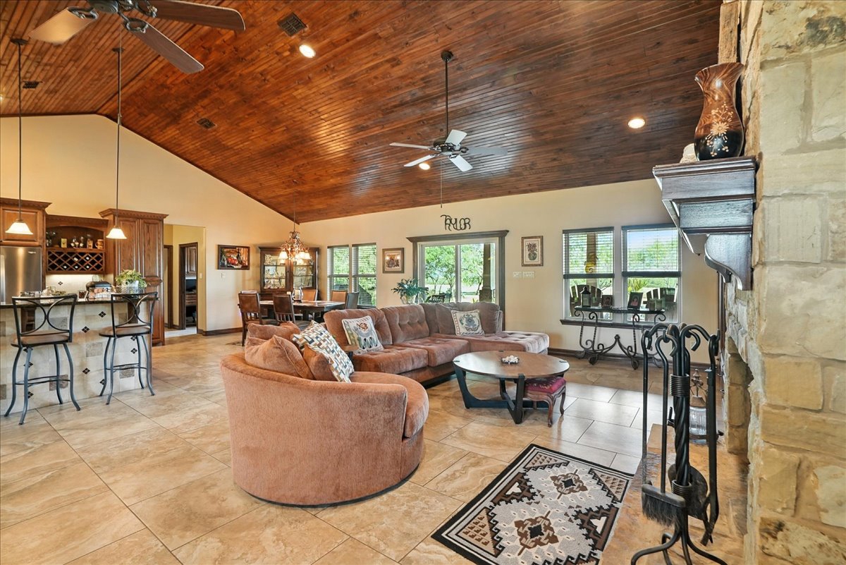 rock wood-burning fireplace serves as a stunning focal point. To one side