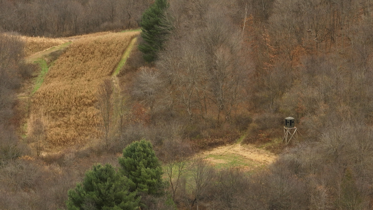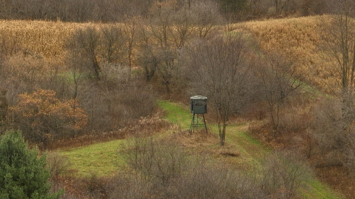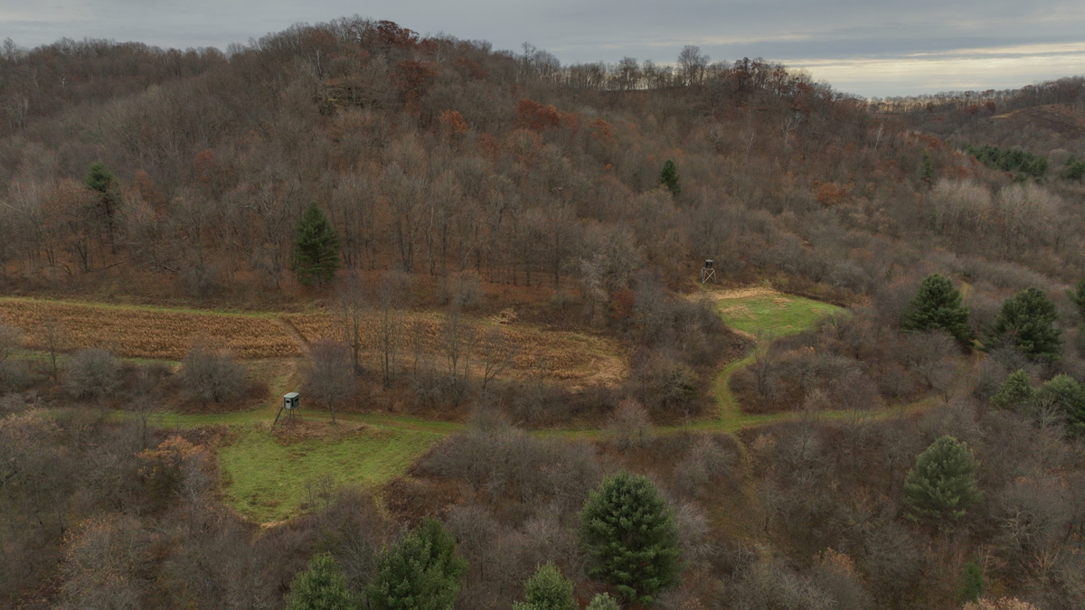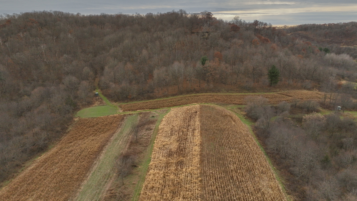 This is the heart of Wisconsin’s legendary hill country—where the terrain folds and funnels whitetails like nowhere else. Three dominant ridge systems create natural bedding, travel routes, and rut-cruising corridors. Mature hardwoods, rocky outcroppings, tucked-away bottoms, and a meandering spring provide the kind of habitat that keeps big deer home year-round.