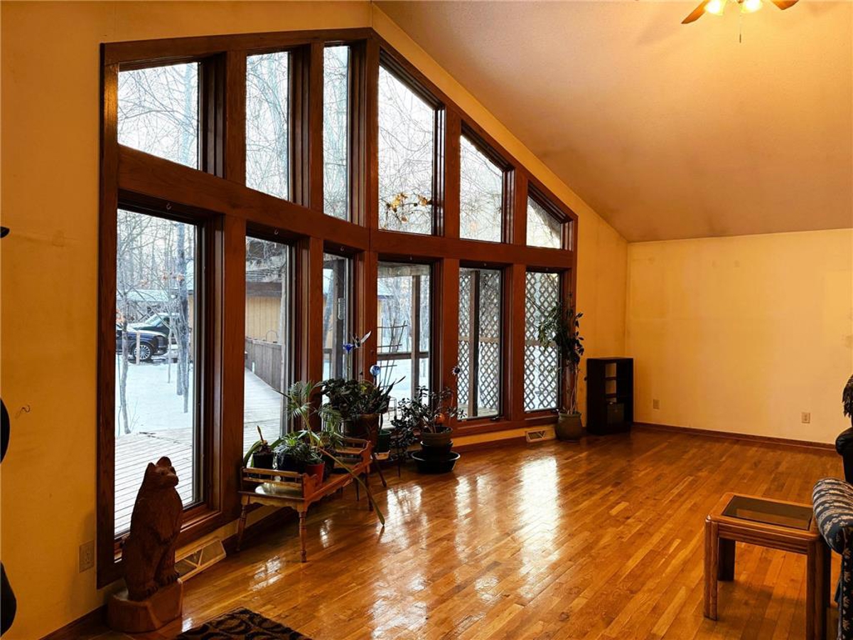 door to be greeted by a 13-foot wall of windows in the living room with a wood