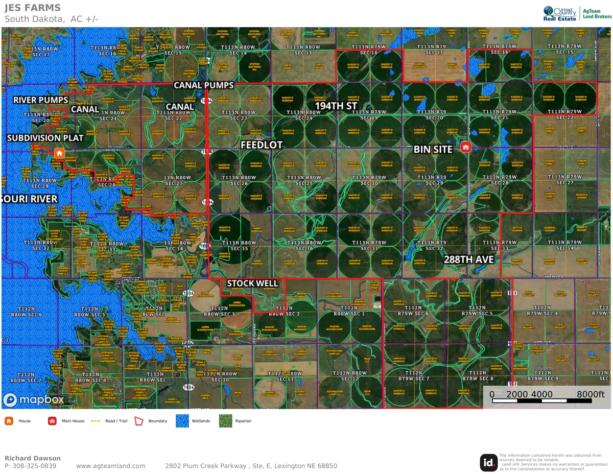 JES Farms represents a rare opportunity for investors or producers seeking a turnkey, highly profitable irrigated farming enterprise with built-in livestock and recreational income. Its scale, efficient Missouri River water access, low pumping costs, productive soils, and strategic location near transportation and processing hubs position it as a standout asset in central South Dakota agriculture. The farm’s integrated systems support high-output grain production while providing multiple revenue layers for resilience and returns.Farm Service Agency (FSA) Data:Cropland Acres: 14,961.94. Corn Contract Acre Base: 10,726.2 PLC Yield: 139 Bu.Wheat Contract Acre Base: 1,187.52 PLC Yield: 38 Bu.Soybean Contract Acre Base: 1,334.08 PLC Yield: 38 Bu.Lake Oahe: Lake Oahe is a massive man-made reservoir on the Missouri River, located just north of Pierre, South Dakota. It stretches approximately 231 miles northward to near Bismarck, North Dakota, covering about 370,000 acres with over 2,250 miles of shoreline. As the fourth-largest reservoir in the United States, it offers excellent fishing (walleye, northern pike, catfish, and bass), boating, camping, hunting, and recreation at dozens of shoreline areas. The lake is formed by the Oahe Dam and is a popular destination for outdoor enthusiasts.Sheehan JES Propery Lakeshore Development: On the extreme northwest corner of the farm, there is a tract known as “The Pensinsula” with extrends into the Missouri Rive/Lake Oahe ..The owner of JES, Harvey Sheehan, had this tract professionally surveyed and plat mapped for a subdivision development. The masterplan was approved by Sully County in 2021. This tract could be split from the balance of the farm and sold separatedly. The Masterplan map is attached in “Documents”. The size of the tract can be adjusted according to the Buyer’s wishes. 2025 Estimated Real Estate Taxes: $188,000the property information has been obtained from sources deemed reliable. AgTeam Land Brokers, LLC is not responsible for errors or omissions. All boundary lines on all maps are for illustrative purposes only and are not a guarantee of precise property boundaries. All prospective Buyers are encouraged to perform their own property due diligence.