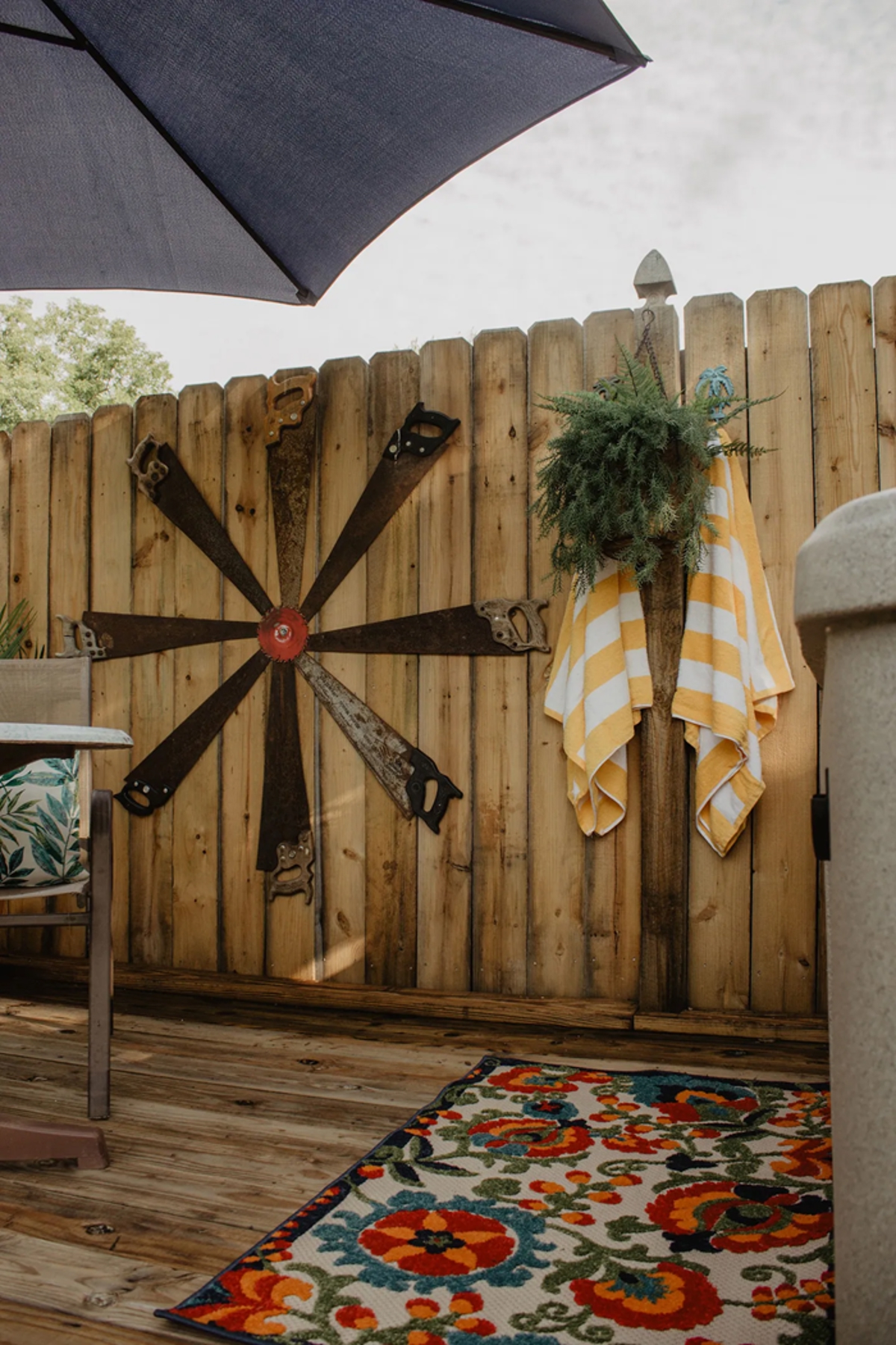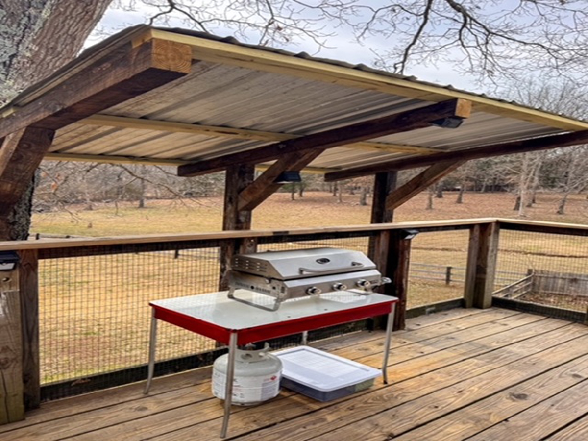 Covered Patio with a built-in grill and ceramic tiles (centers a color TV).
