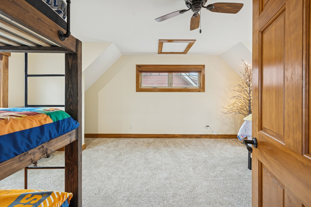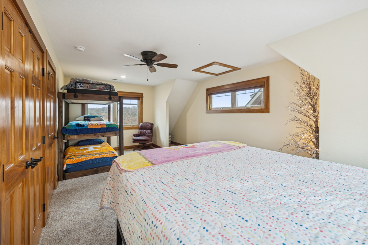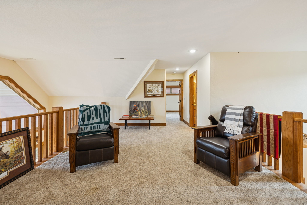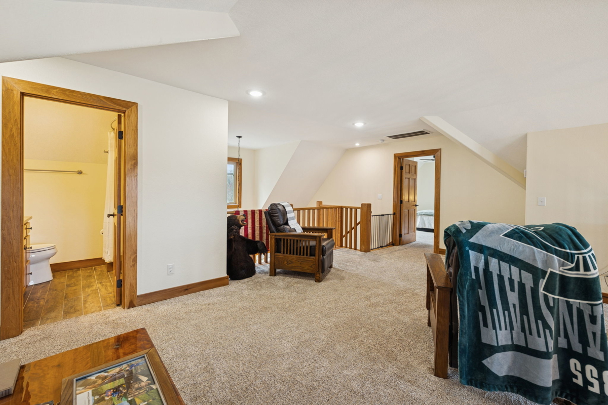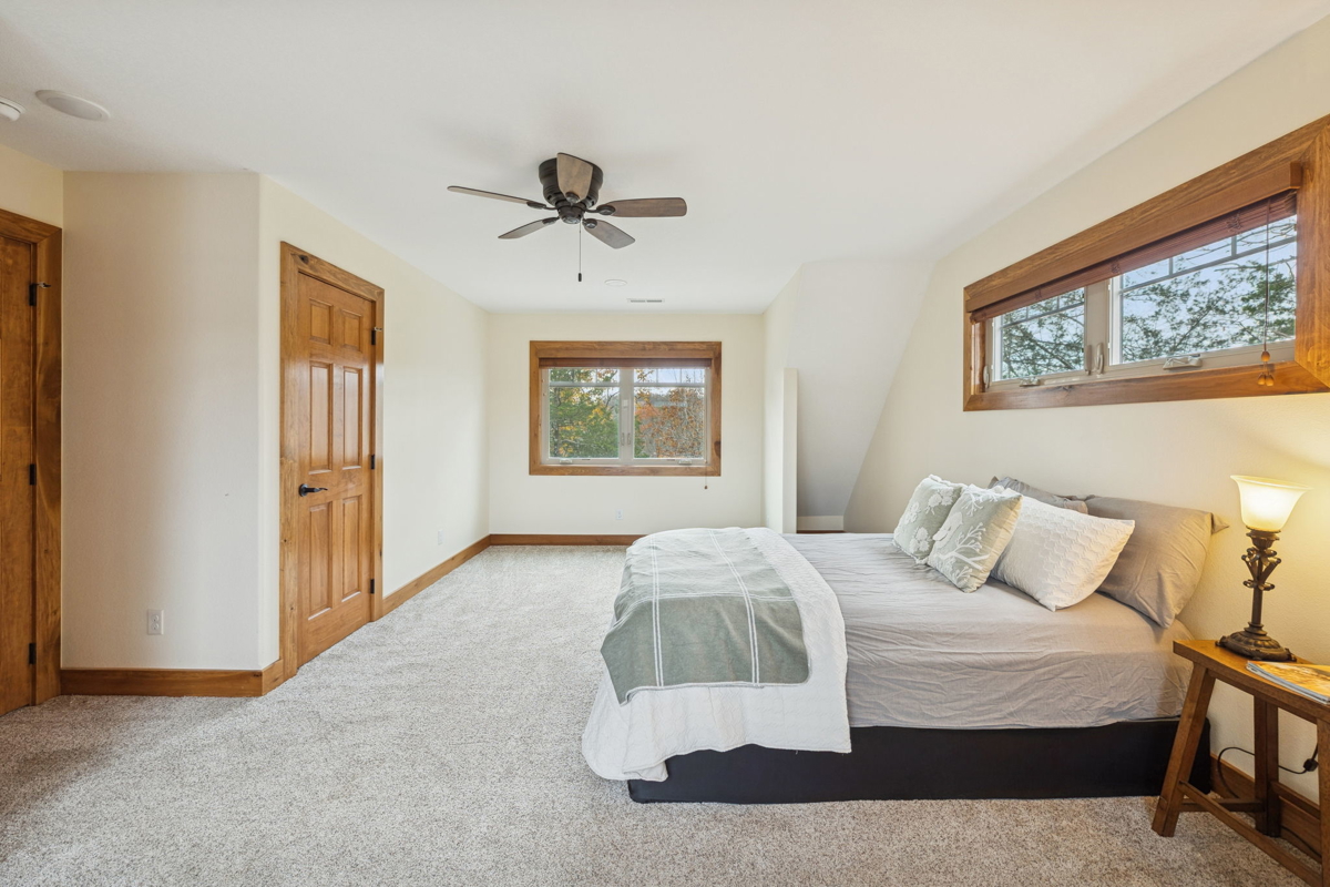 The main-level master suite offers breathtaking lake views, a large walk-in closet, and a luxurious en-suite bath featuring a walk-in tiled steam shower. Upstairs, a generous sitting area anchors the second floor, accompanied by two additional bedrooms and a full bath—each capturing views of the lake.