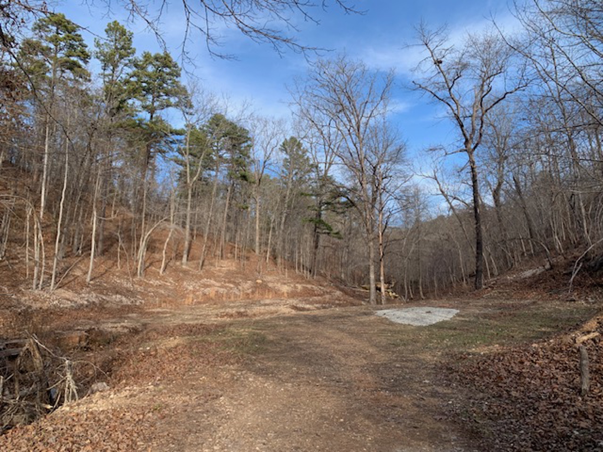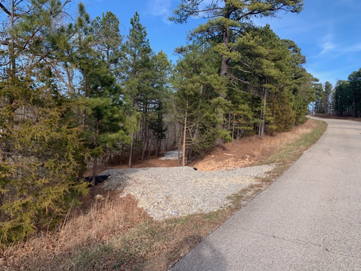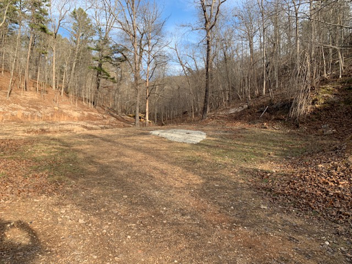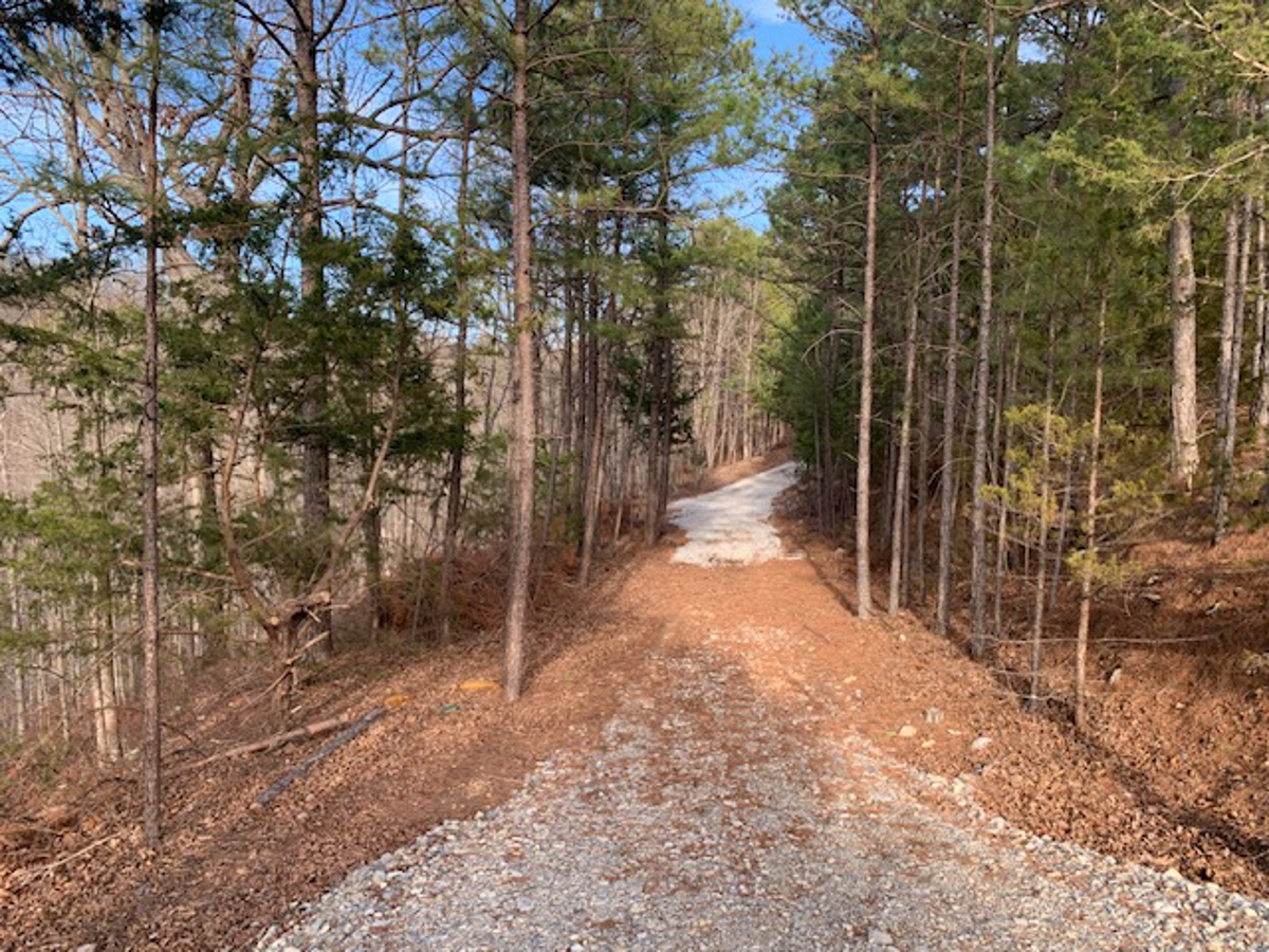 away at the end of the driveway is a beautiful building site that has been