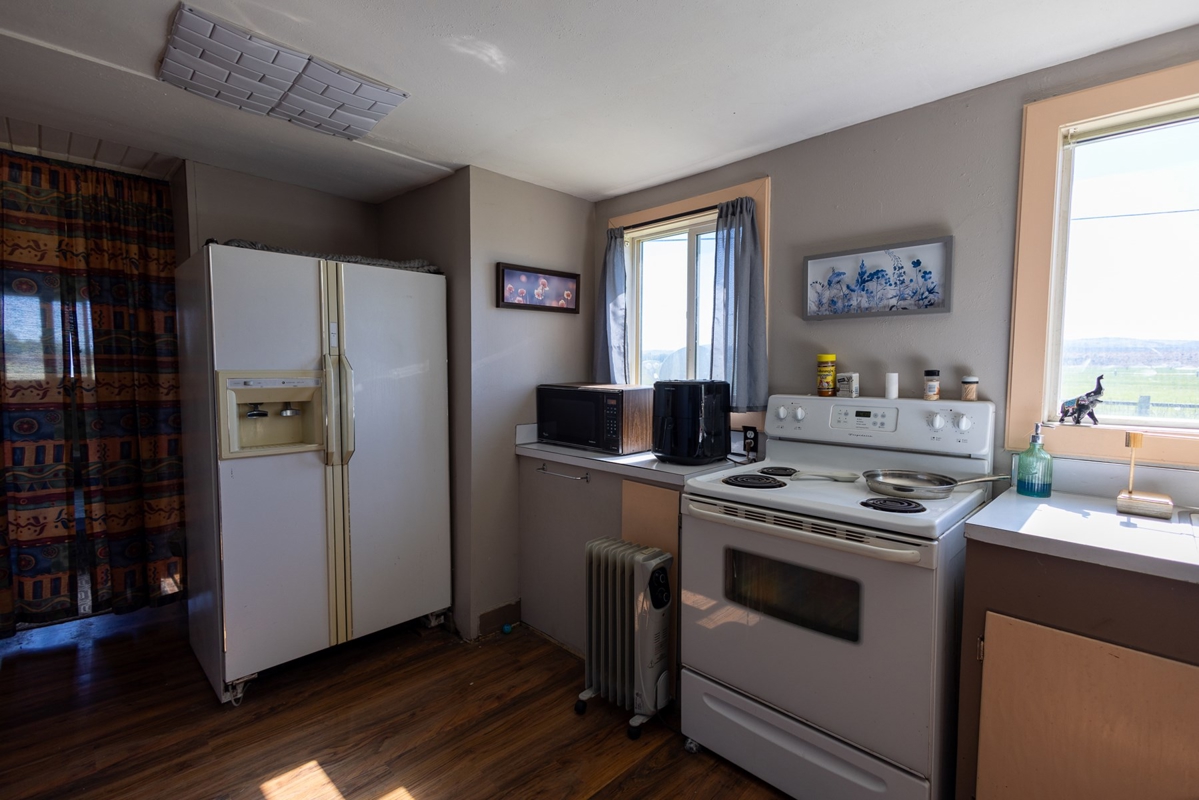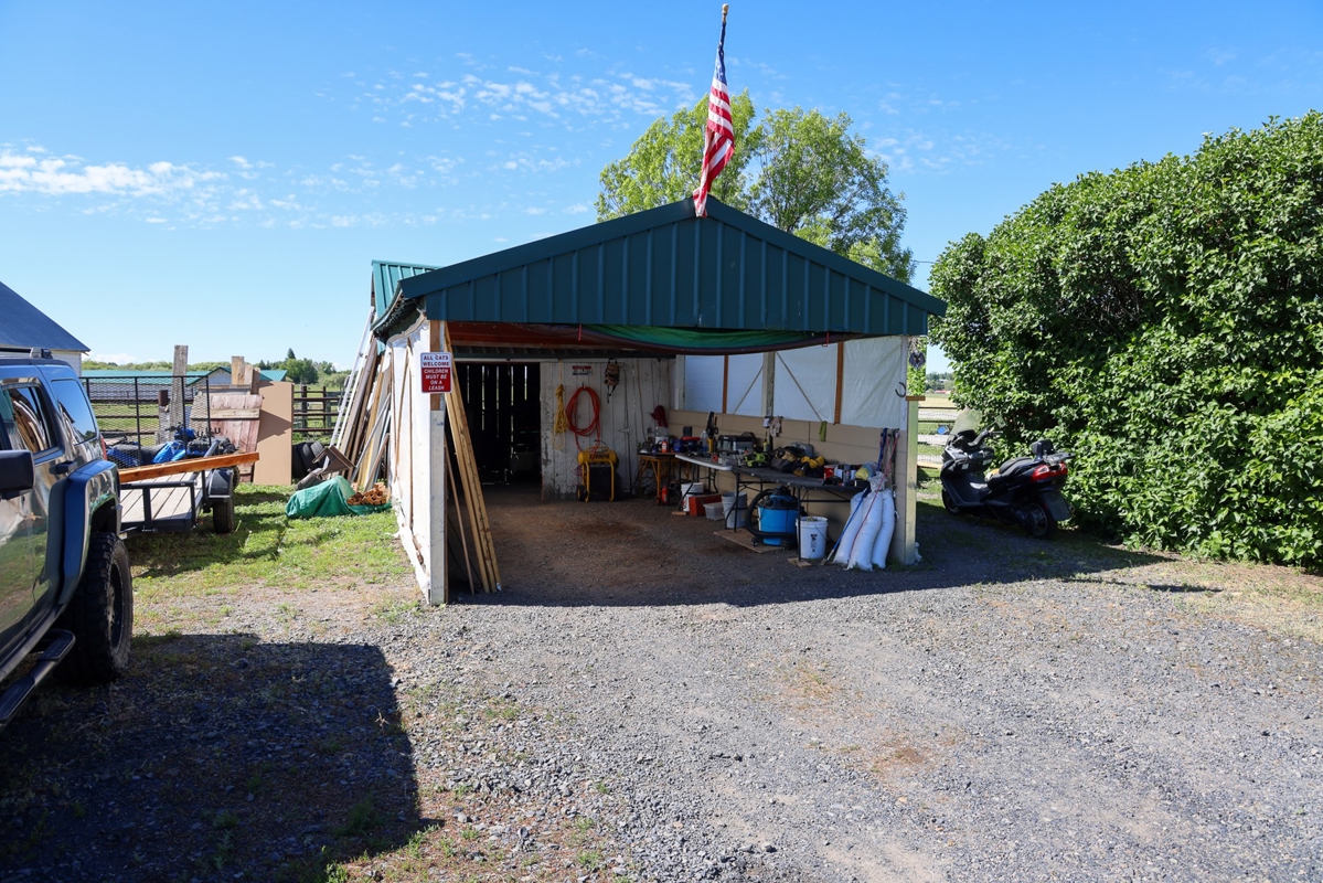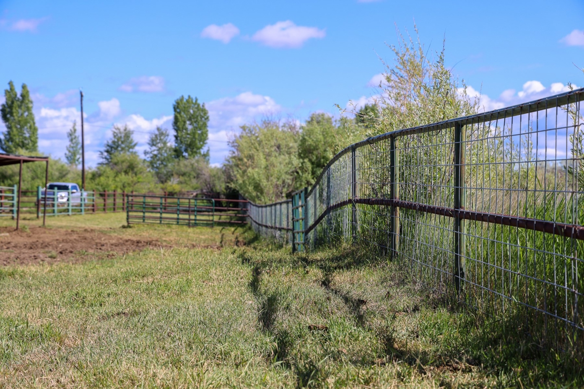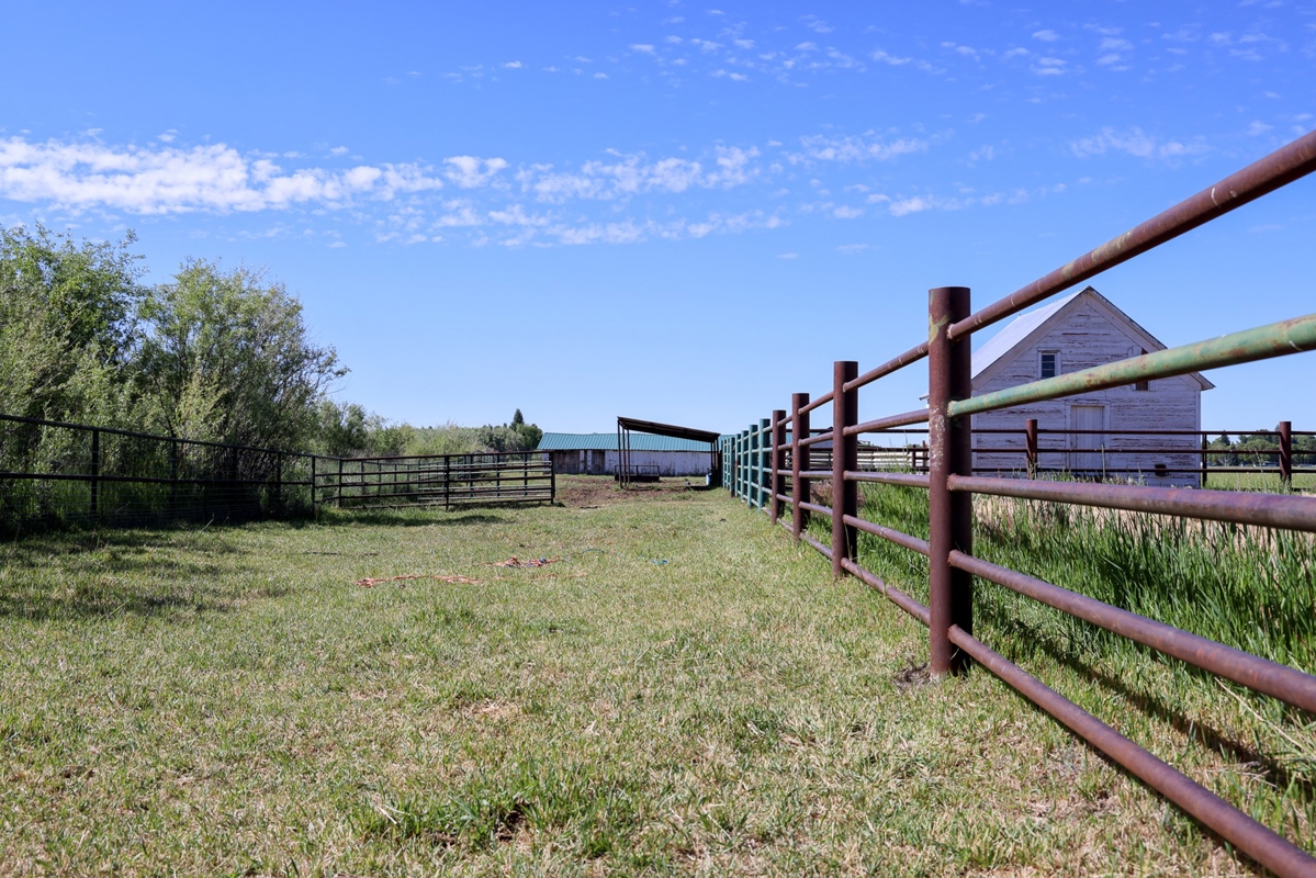 The original homestead residence spans 1,188 square feet, featuring two comfortable bedrooms and a full bathroom. The home’s inviting interior boasts wood flooring through the family and dining areas, complemented by a ceiling fan that adds to the welcoming atmosphere. The galley-style kitchen is thoughtfully arranged to maximize space, situated near the bathroom, laundry, and utility rooms. Upstairs, additional storage space offers practicality without sacrificing the home’s cozy feel. Outside, mature trees and graceful willows create a private oasis surrounding the home, while a detached carport and adjoining outbuilding provide ample storage close at hand. The property’s working corrals, livestock sheds, and barn are conveniently located nearby, including a covered corral area complete with an alley and squeeze chute, making this farm fully operational and ready for immediate use.