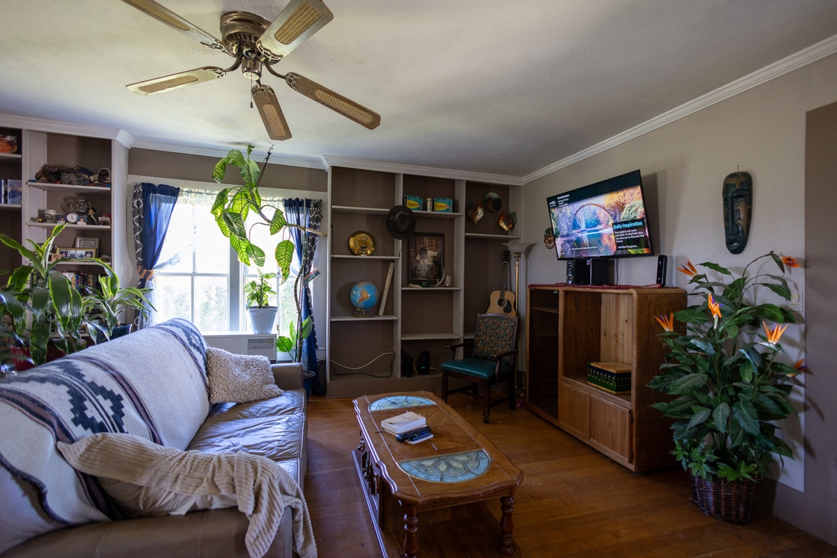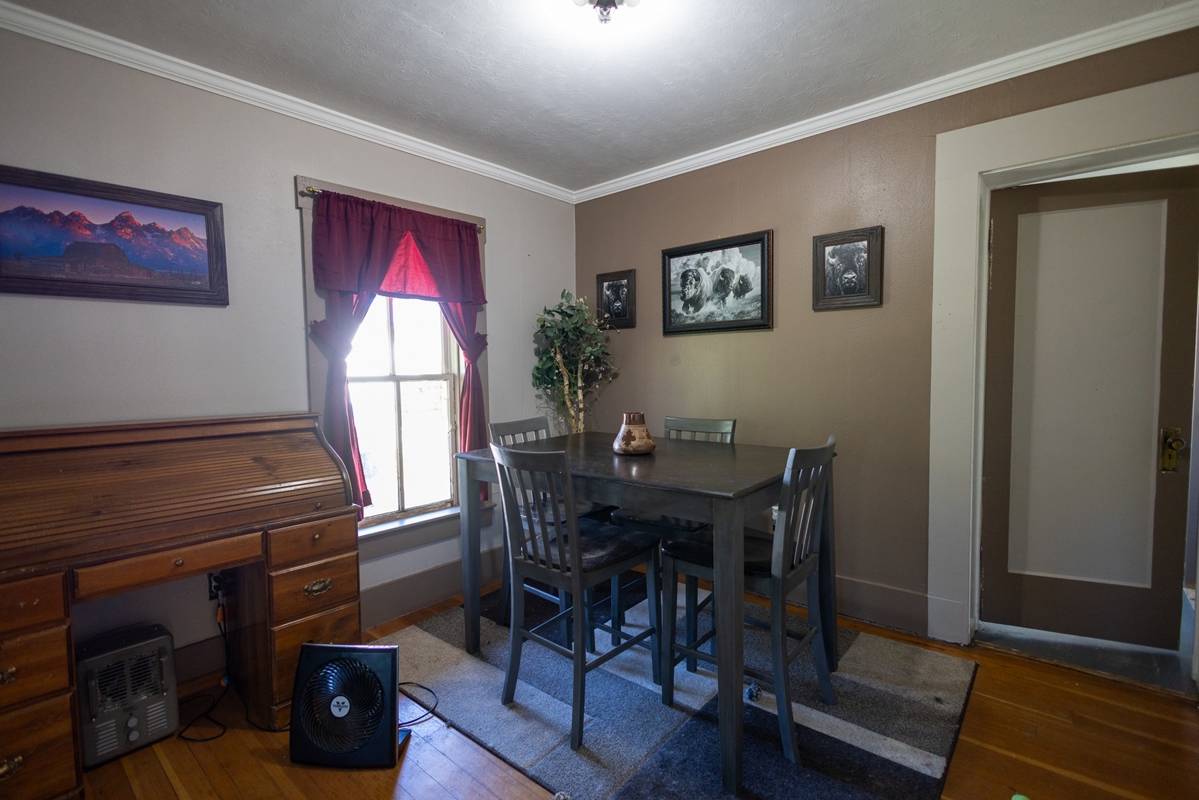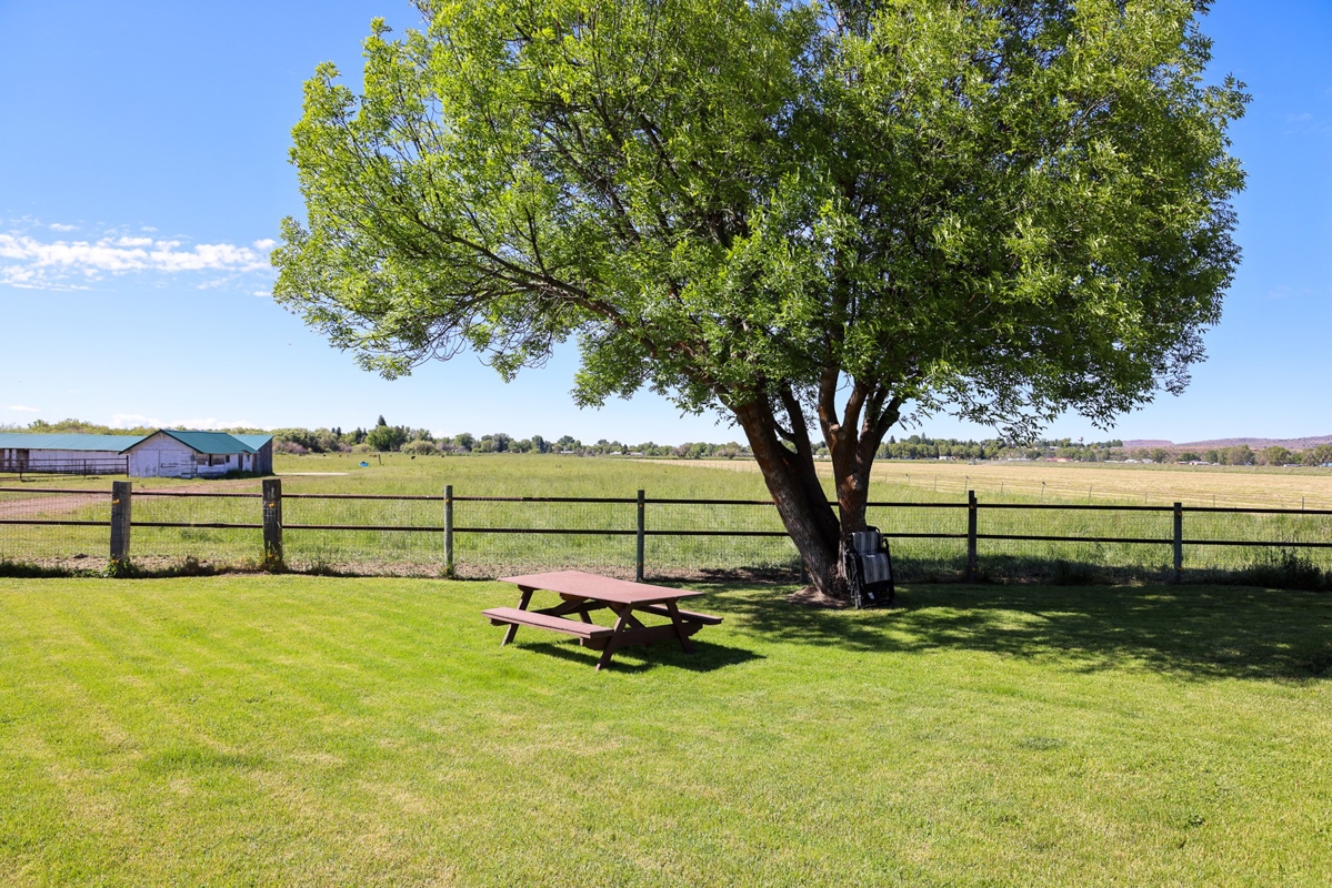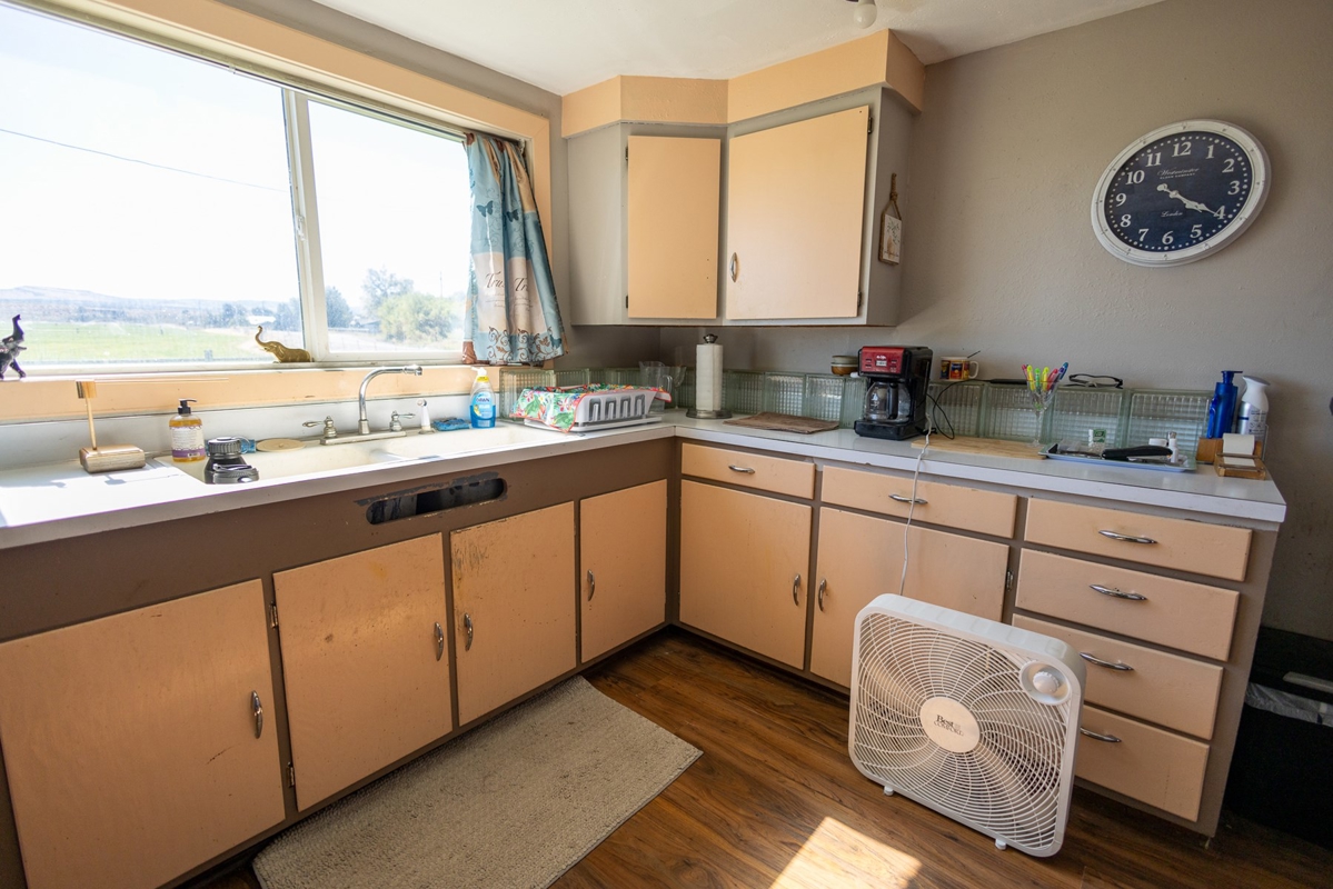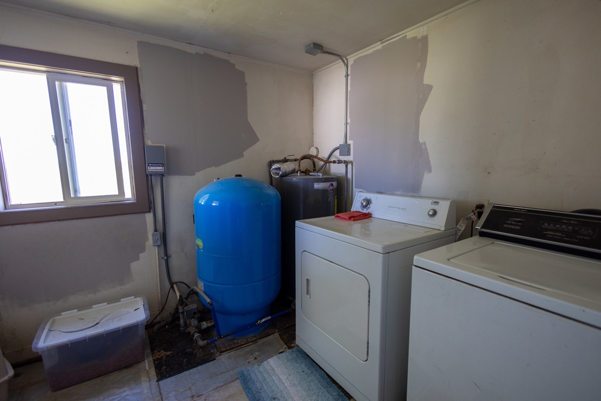 The original homestead residence spans 1,188 square feet, featuring two comfortable bedrooms and a full bathroom. The home’s inviting interior boasts wood flooring through the family and dining areas, complemented by a ceiling fan that adds to the welcoming atmosphere. The galley-style kitchen is thoughtfully arranged to maximize space, situated near the bathroom, laundry, and utility rooms. Upstairs, additional storage space offers practicality without sacrificing the home’s cozy feel. Outside, mature trees and graceful willows create a private oasis surrounding the home, while a detached carport and adjoining outbuilding provide ample storage close at hand. The property’s working corrals, livestock sheds, and barn are conveniently located nearby, including a covered corral area complete with an alley and squeeze chute, making this farm fully operational and ready for immediate use.
