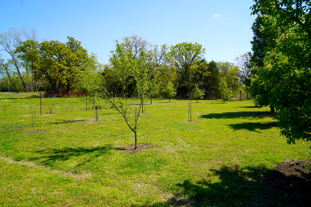 and the expansive gardening areas feature a diverse fruit orchard with peaches,