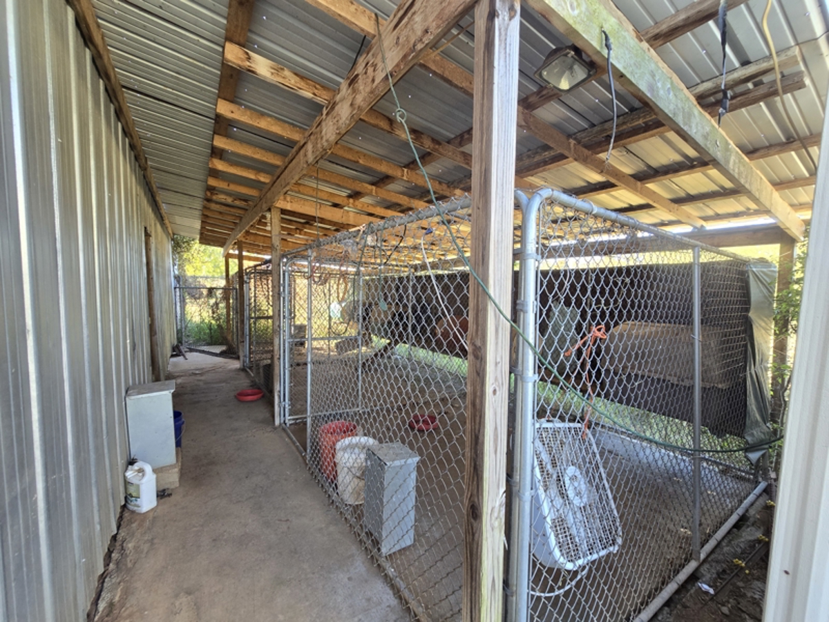 x 30 foot – There are four covered dog pens with concrete flooring, chain link