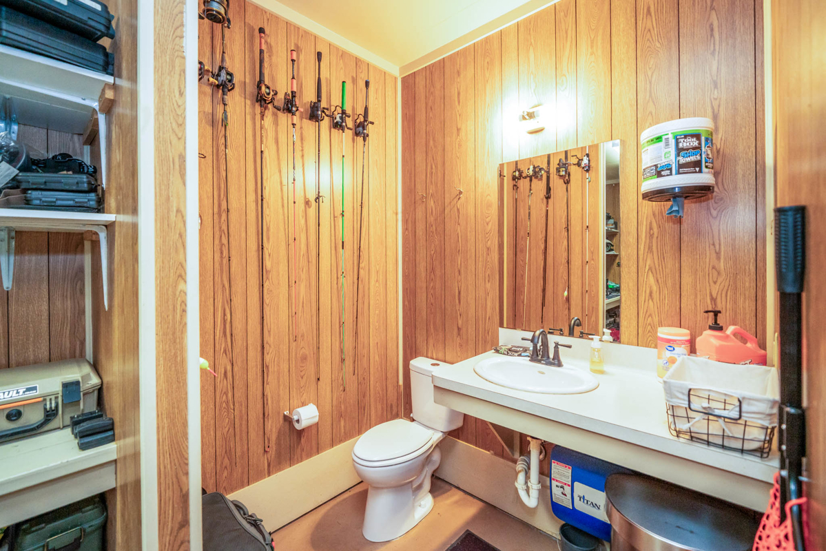 Detached Garage with extra climate-controlled storage, tool storage area, and a half bath.