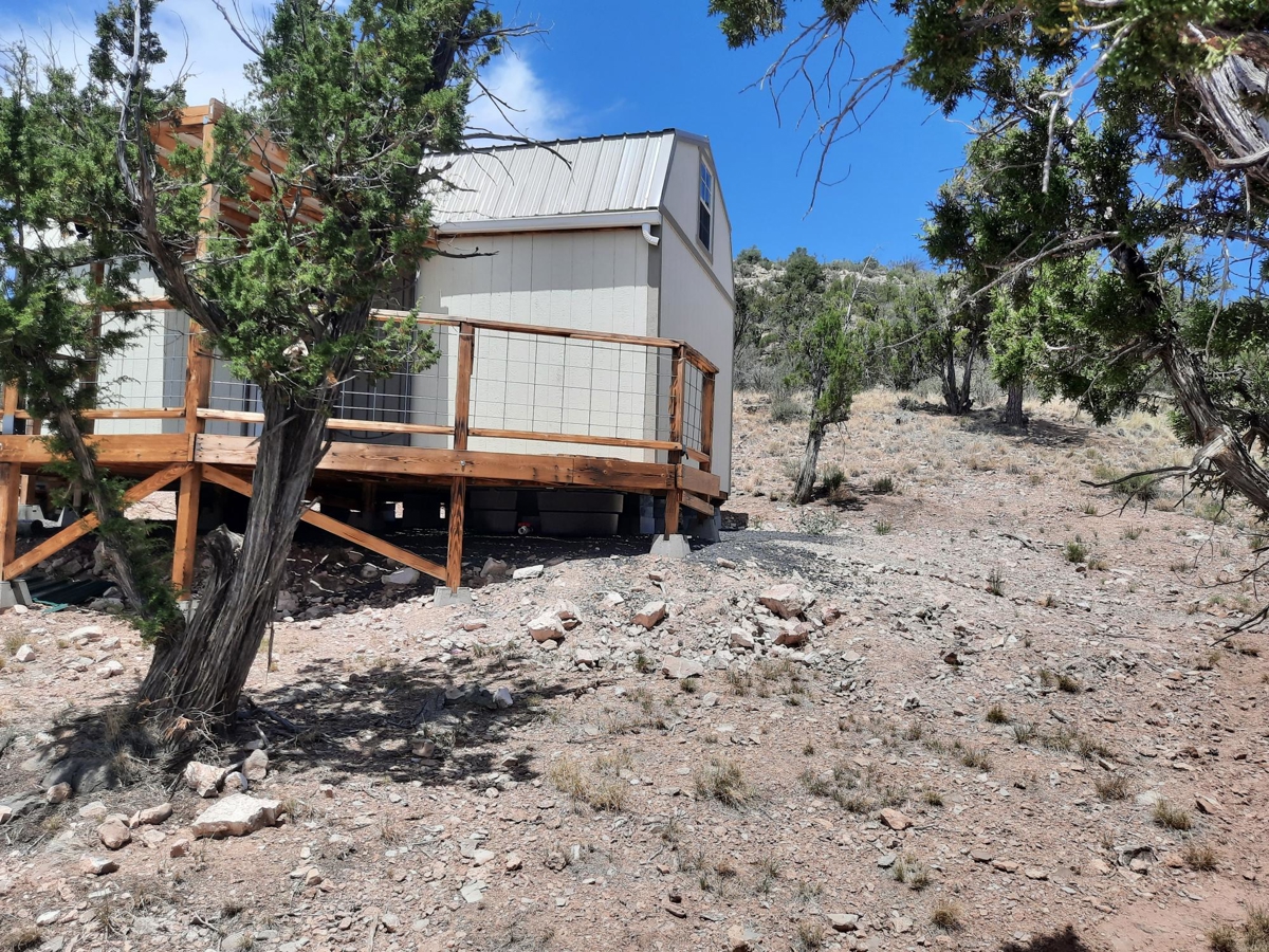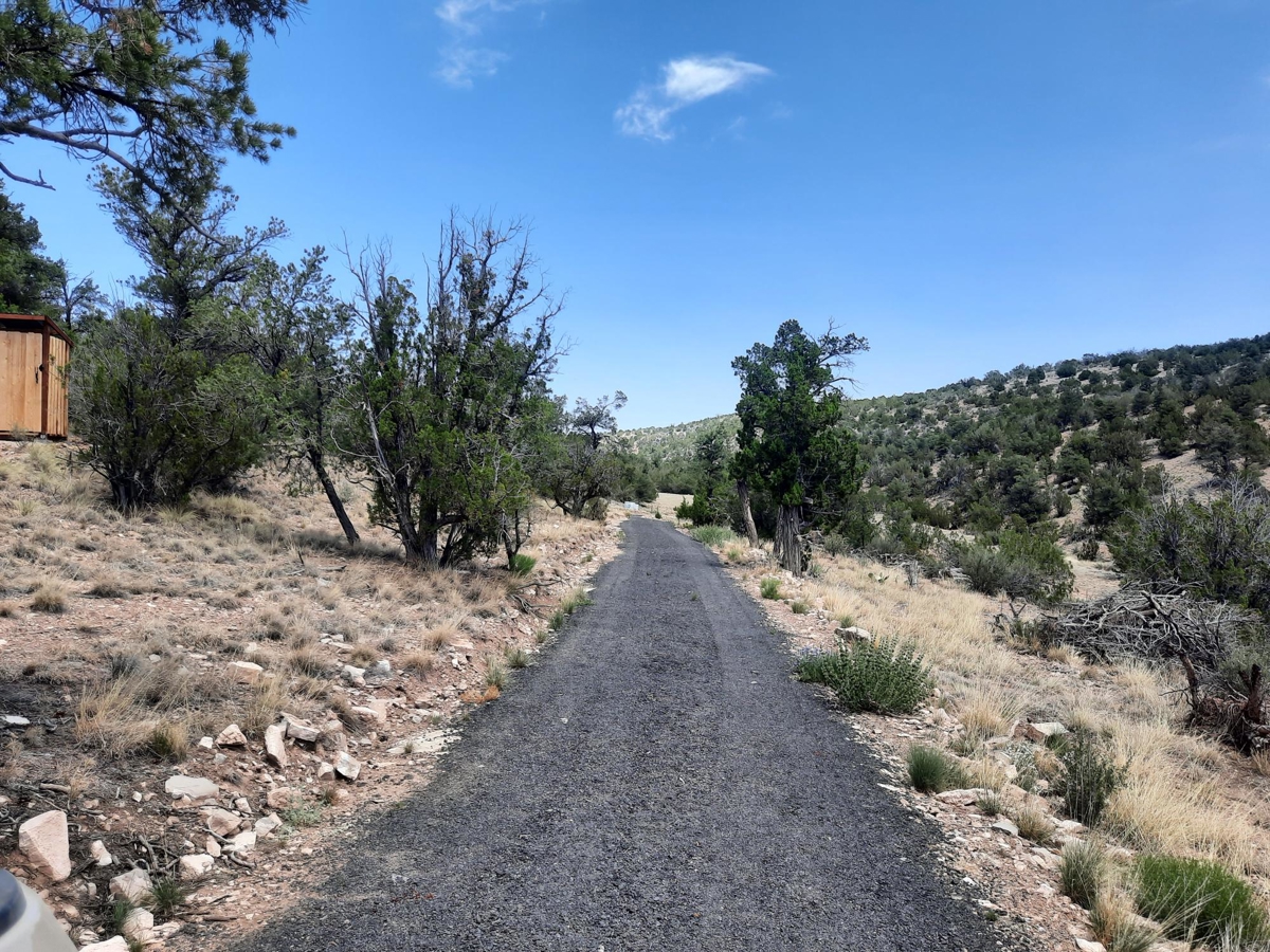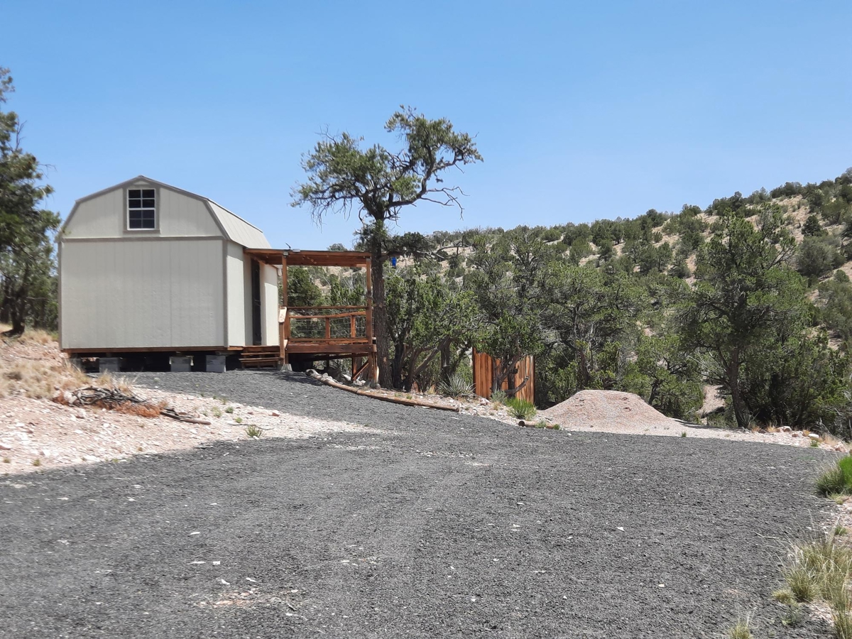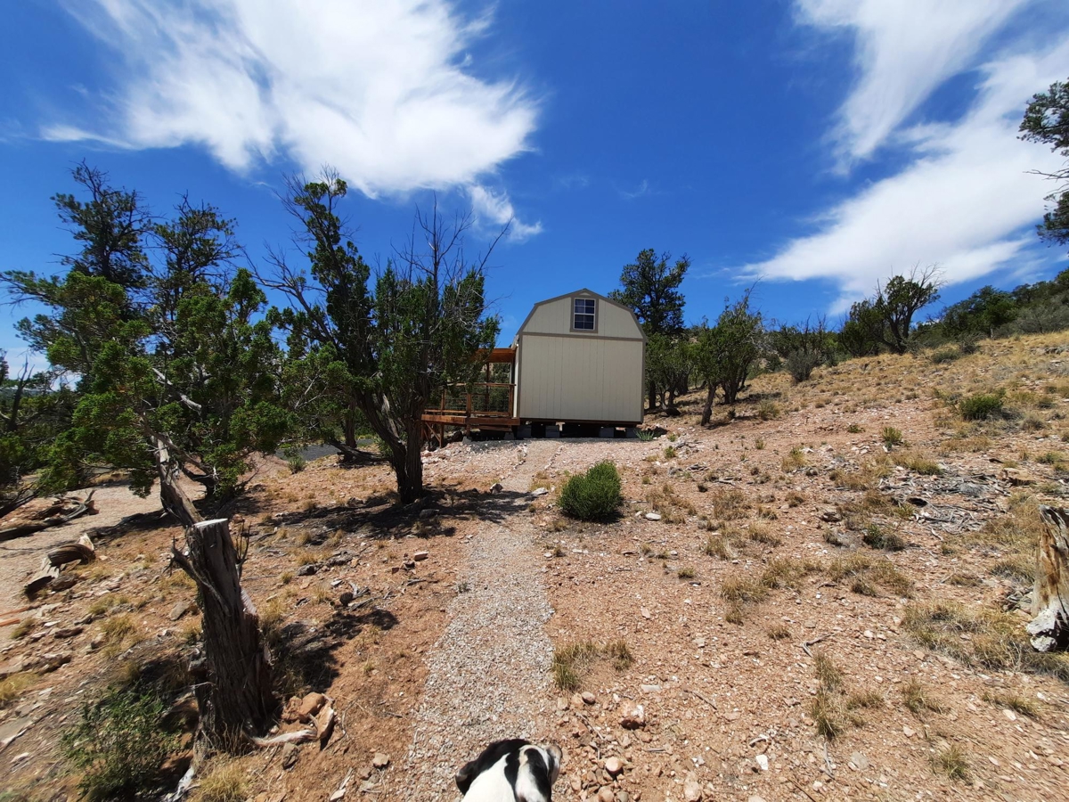 PRIVATE CANYON RETREAT – Nestled at the top of a private canyon on 10 acres sites this perfect retreat. The permitted 12X24 cabin is almost complete, situated for that perfect views off the covered deck. Nice walking trails lead to the shower house with a propane water heater and outhouse with a composting toilet. A small carport to store your toys is perfect. Above the cabin is a nice clearing to build a larger cabin with even BIGGER views!! Surrounded by State land and mountains. The property is partially fenced to add to your privacy. Only 6 miles from town and only .7 miles off the county maintained road. 35.31314,-113.01057
