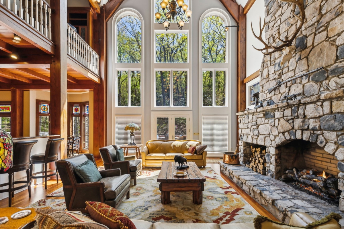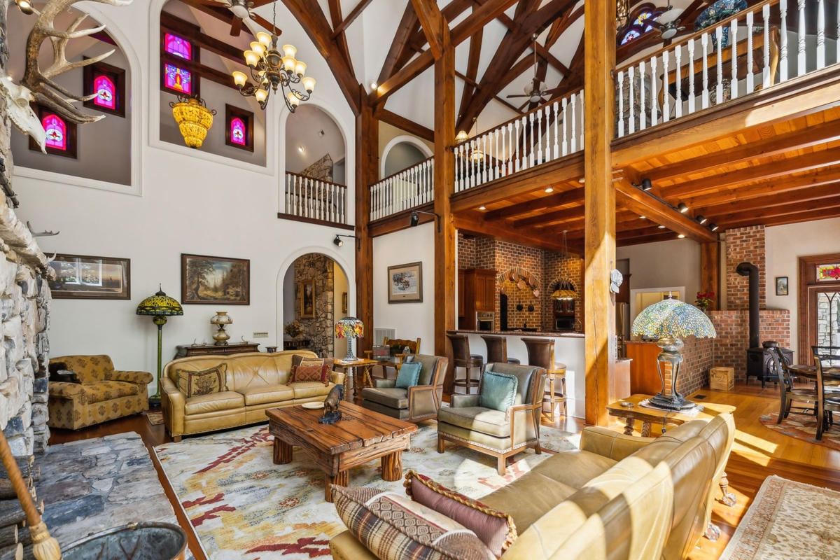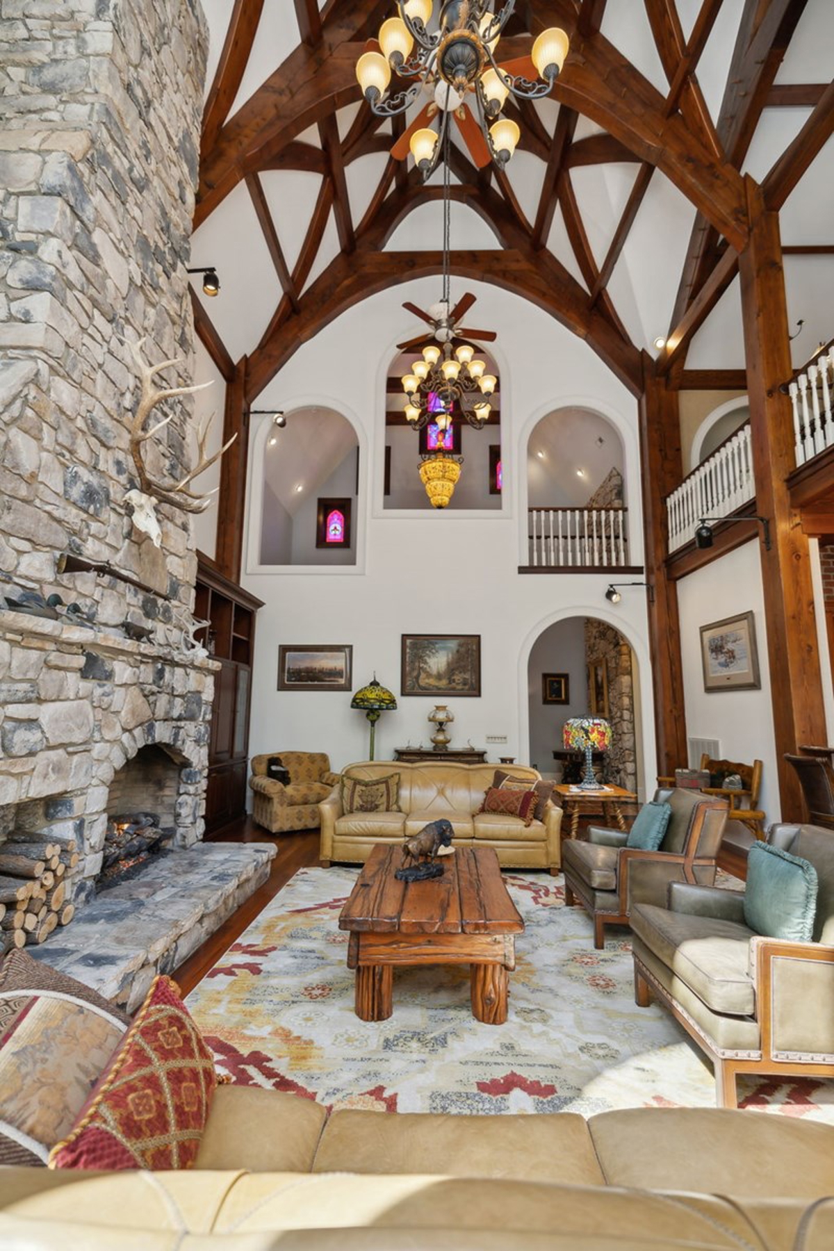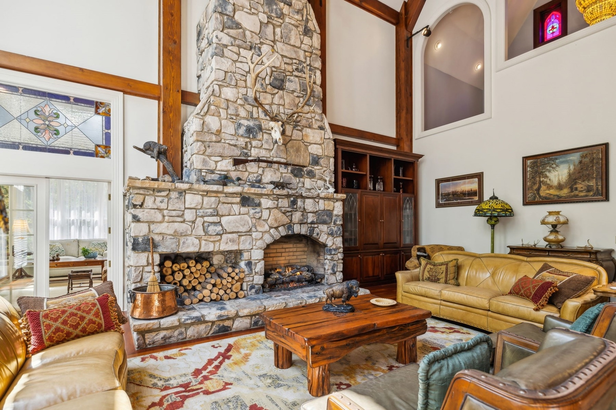 Great Room: A stunning 38-foot ceiling with a stone fireplace and a mahogany entertainment center, featuring ornate timber framing and stained glass windows.