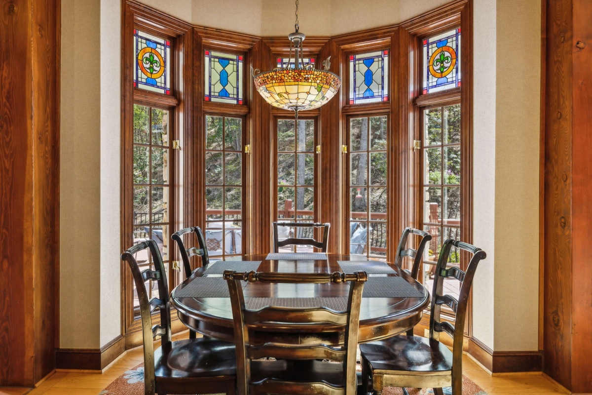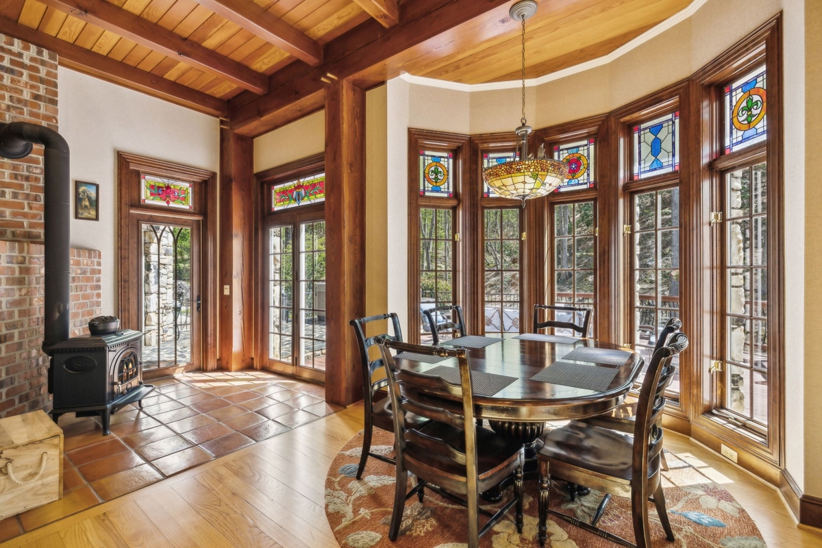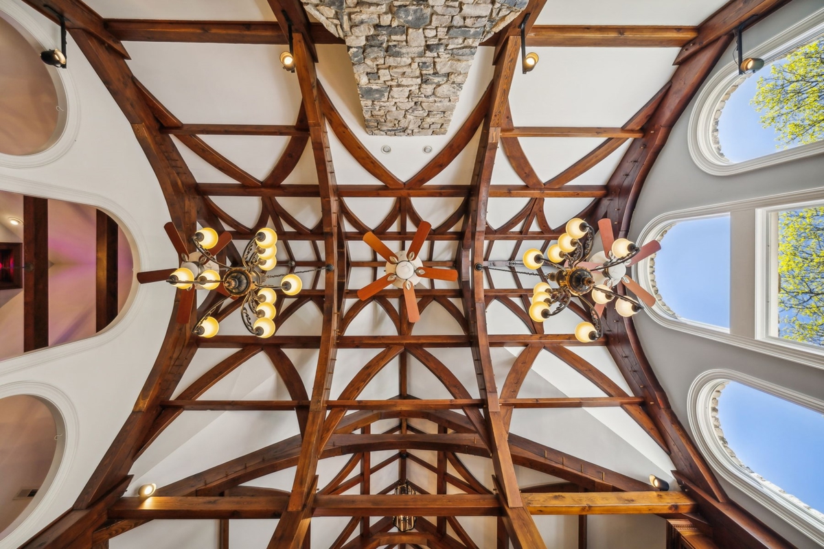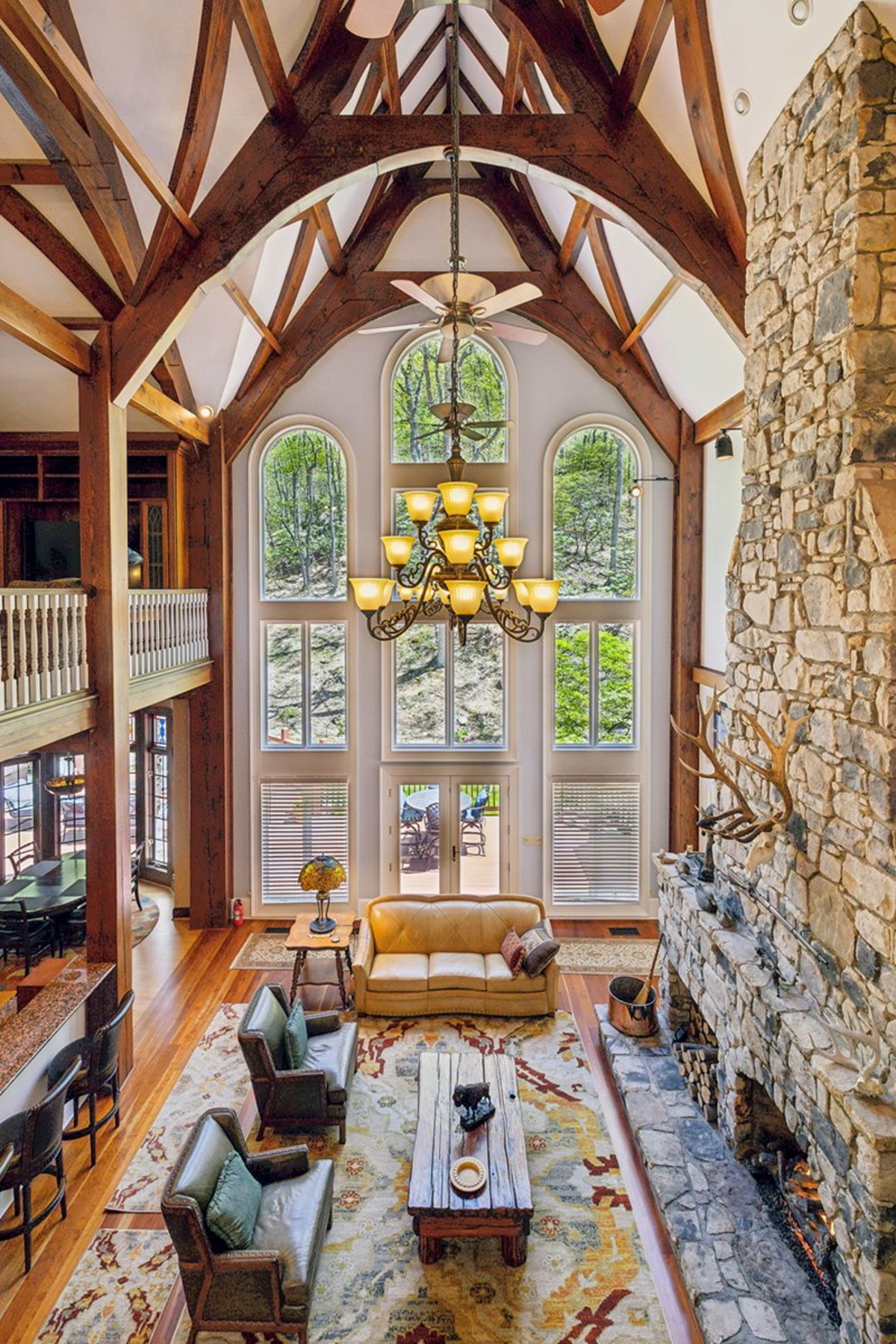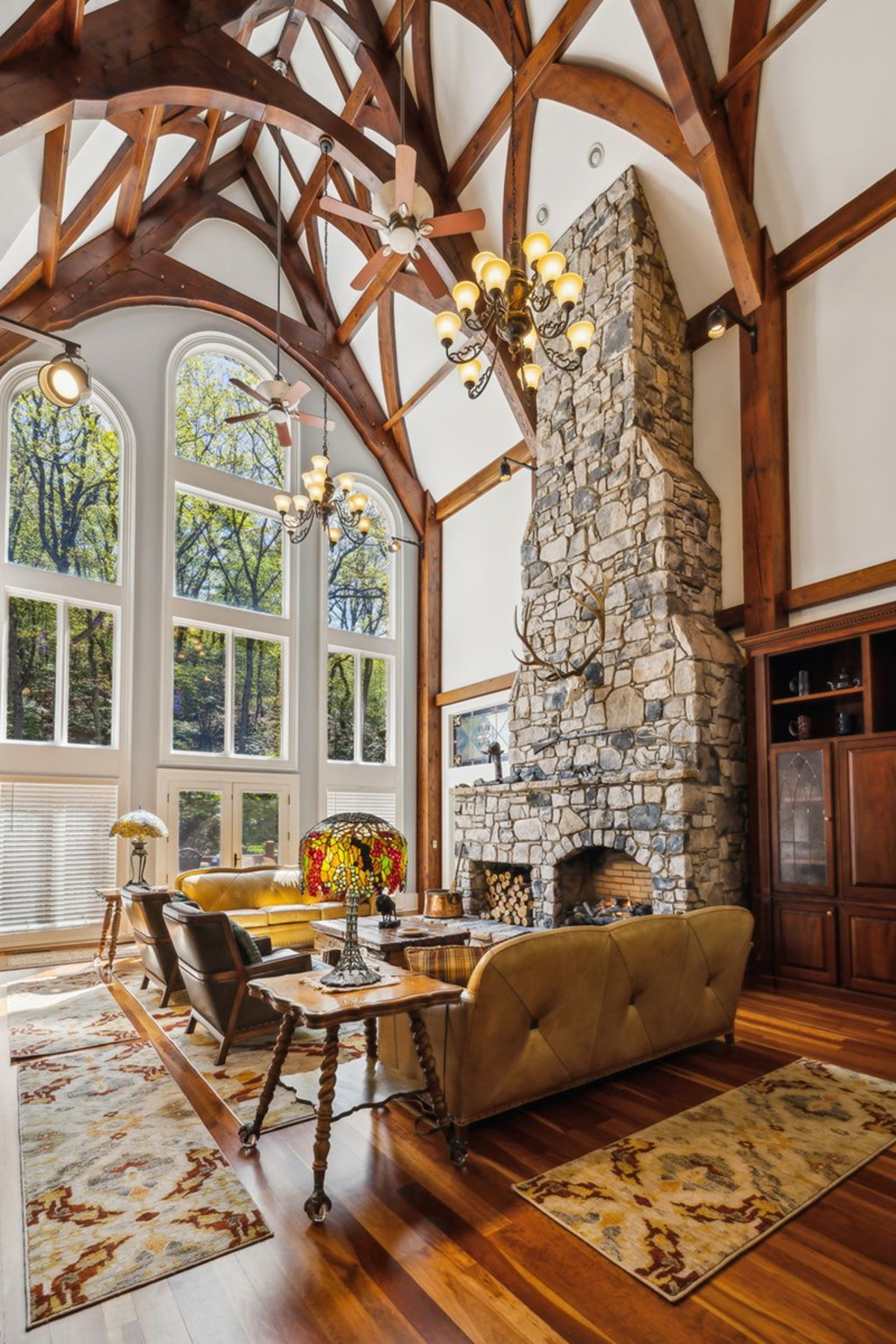 Great Room: A stunning 38-foot ceiling with a stone fireplace and a mahogany entertainment center, featuring ornate timber framing and stained glass windows.