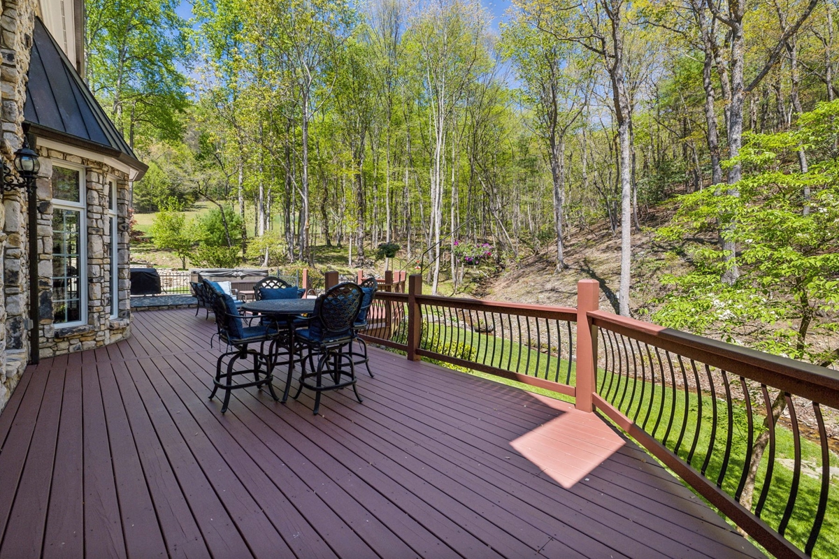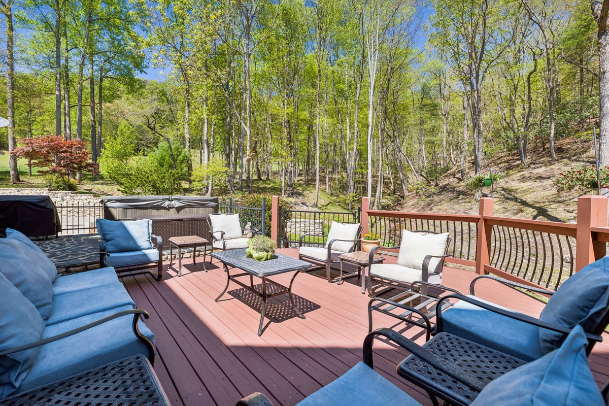 Outdoor Living: Large wood and slate patio with a hot tub, perfect for enjoying the natural surroundings.