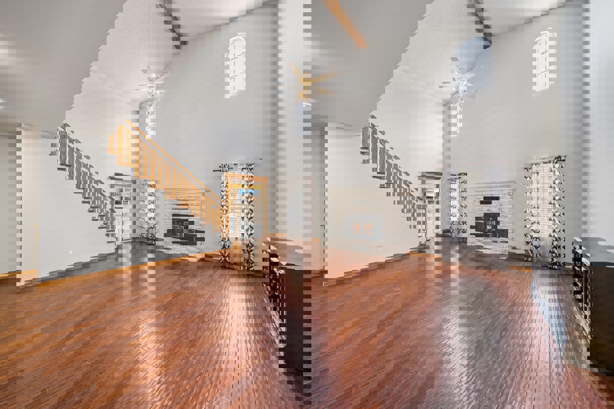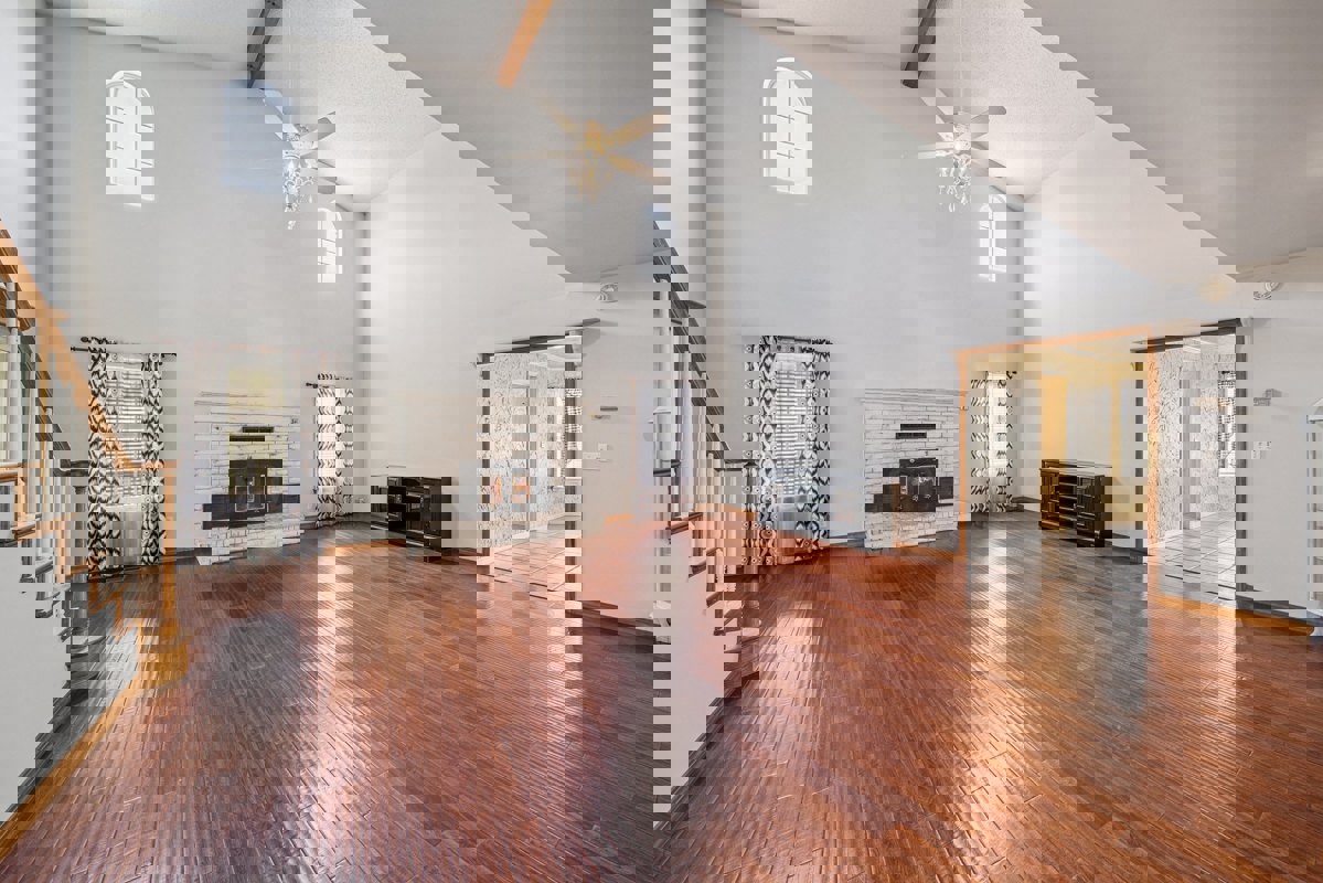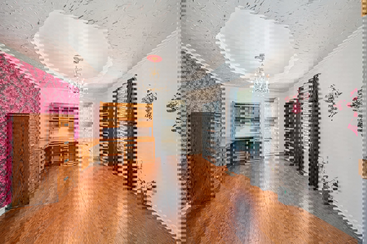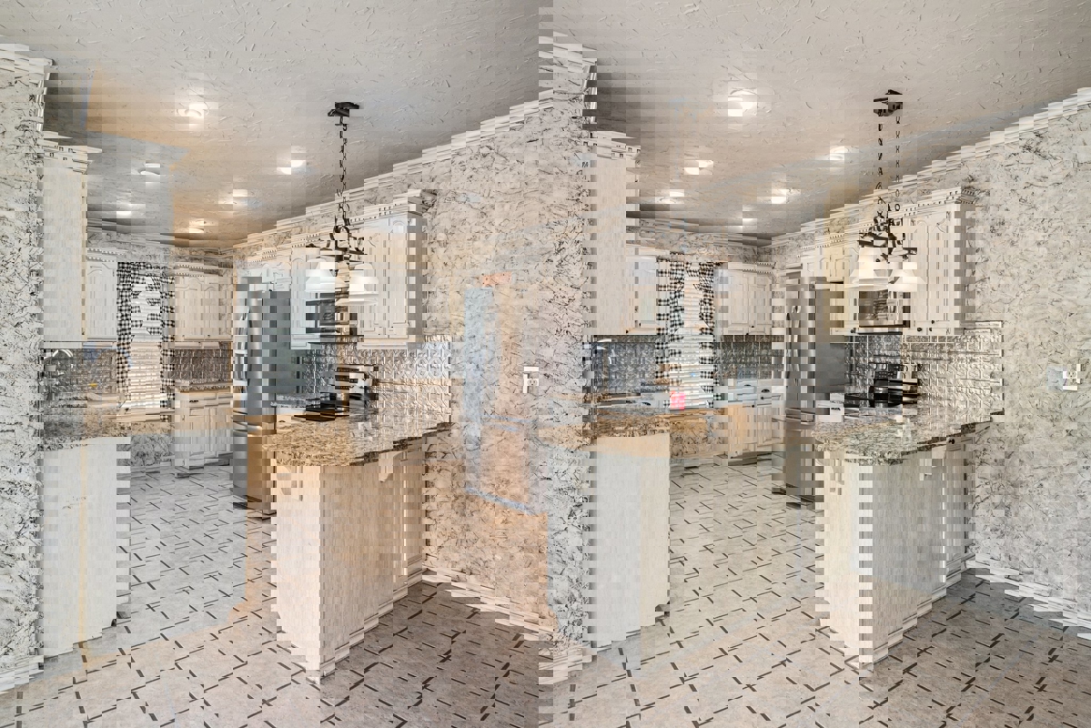 Inside, the large open living area offers a cozy gas fireplace, lots of natural light from the many windows, and beautiful hardwood floors. Just off the living area, behind sliding barn doors, is a versatile space that works perfectly as an office or even a formal dining room. The kitchen is spacious with plenty of cabinets, granite countertops, and all appliances included — even the refrigerator. There’s also a large eat-in area for casual meals.