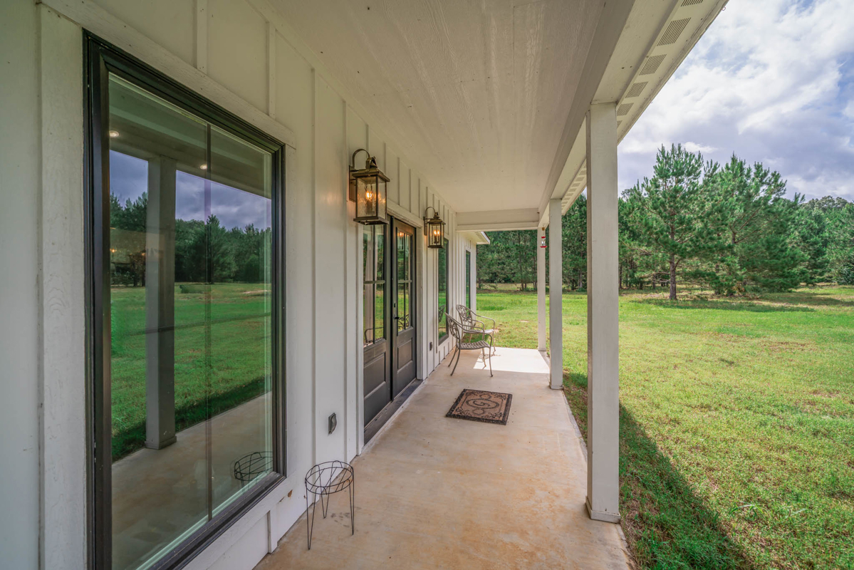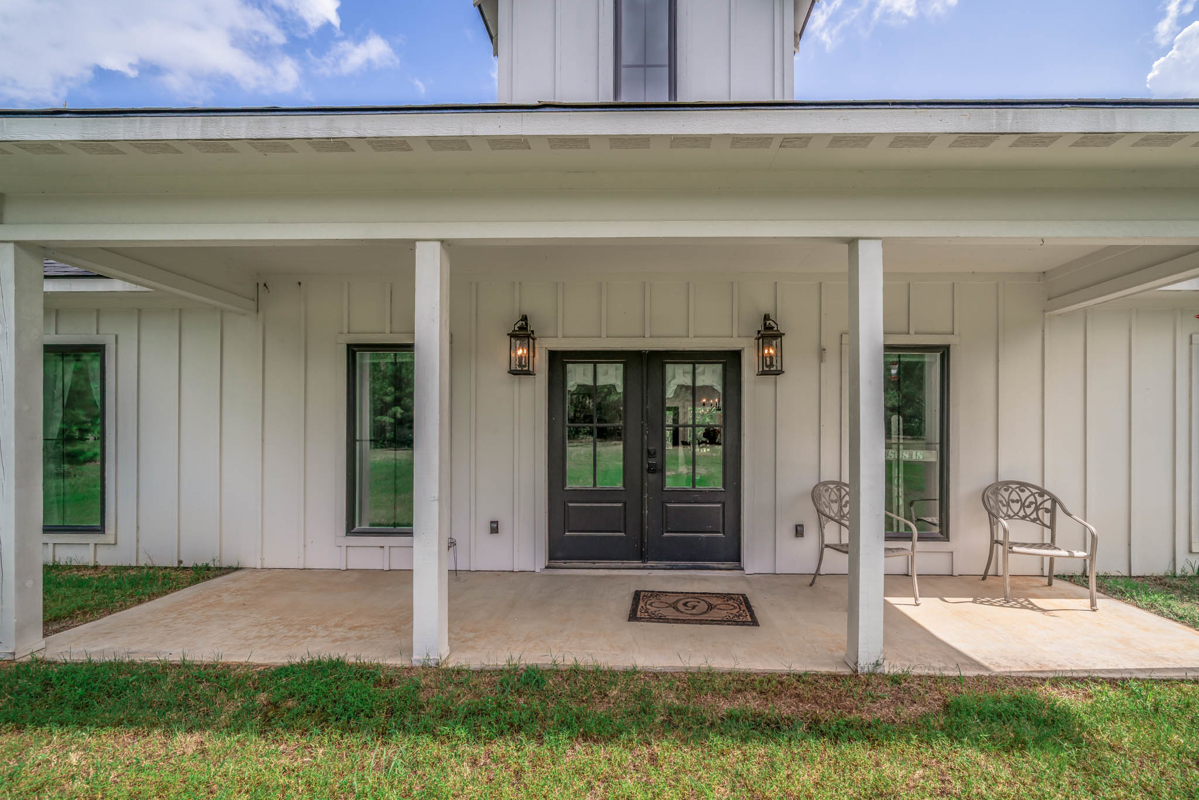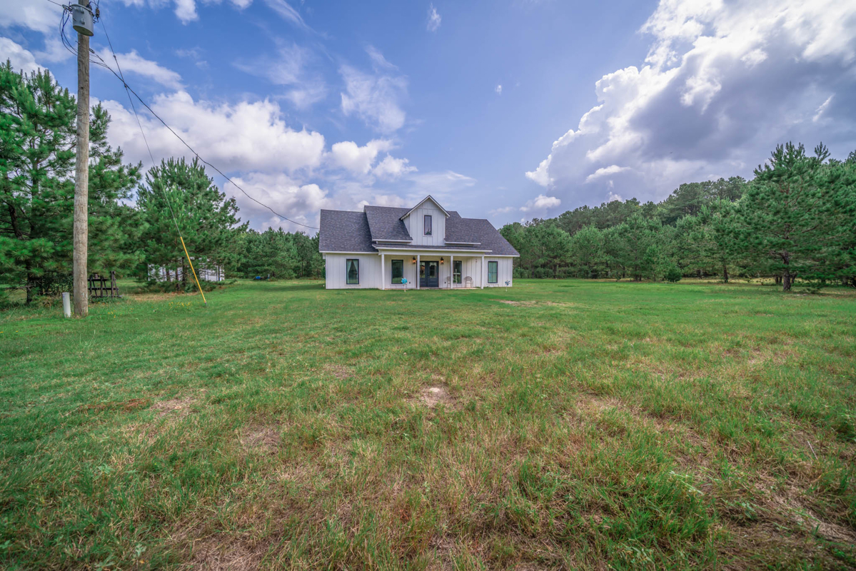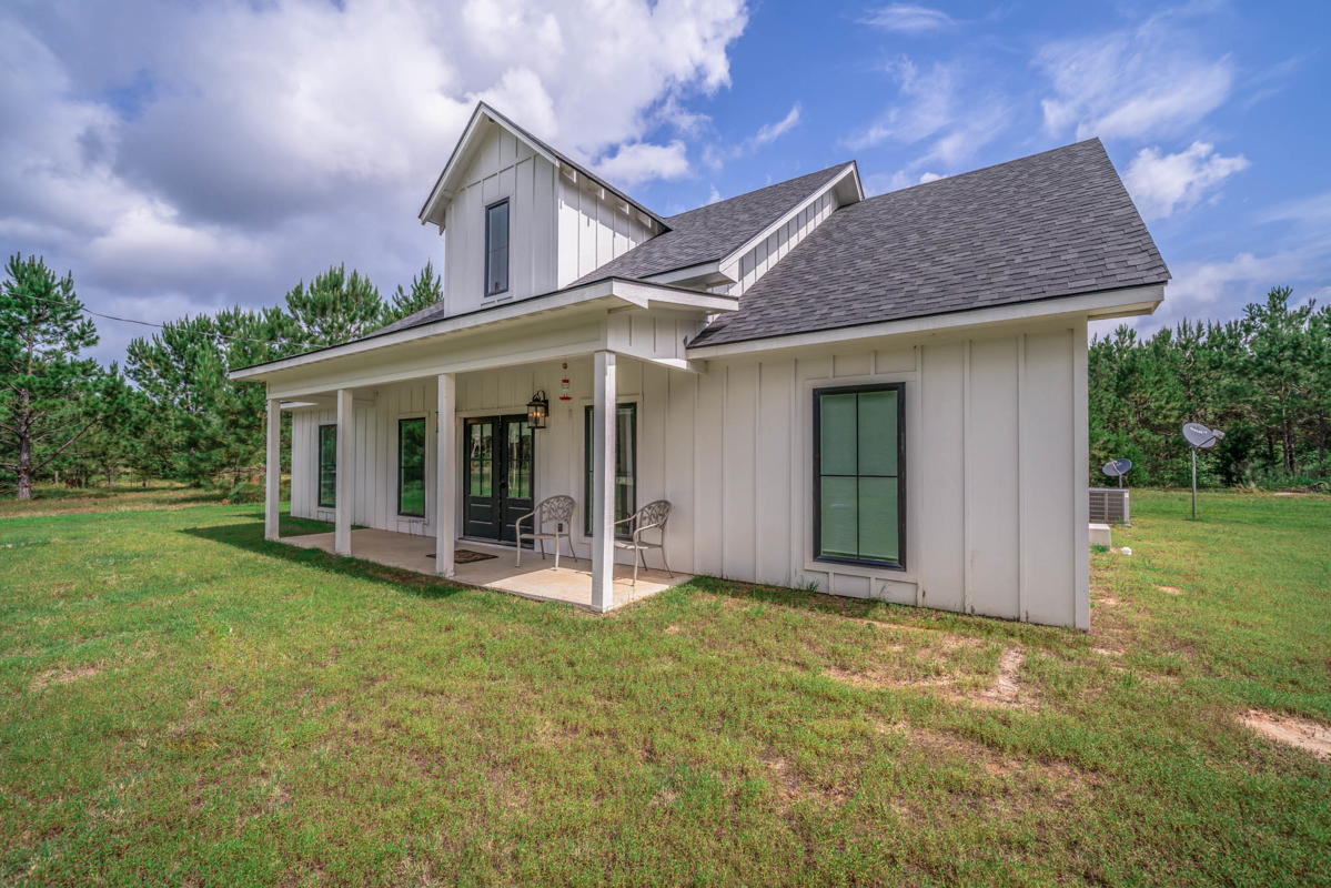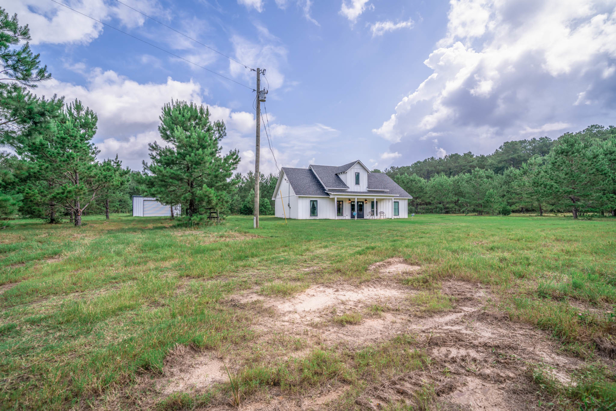 Welcome to 7761 FM 31 S, Carthage, Texas, a stunning 3 bedroom, 2 bathroom farmhouse-style home on 60+/- picturesque acres in Carthage ISD. Built in 2021, this property seamlessly combines modern comforts with rustic charm. This beautiful home showcases modern farmhouse charm with a clean, crisp white exterior and a dark roof. The inviting front porch features double black doors flanked by large windows, creating a bright and welcoming entrance.
