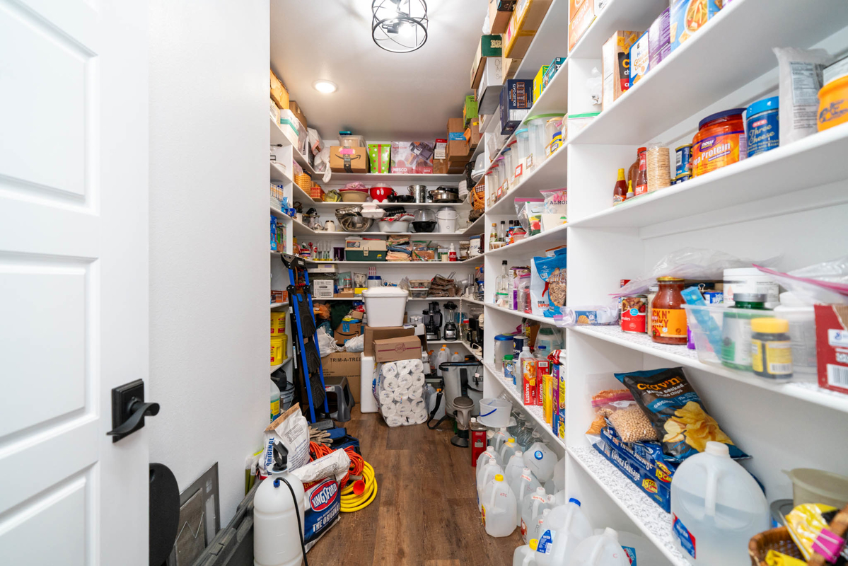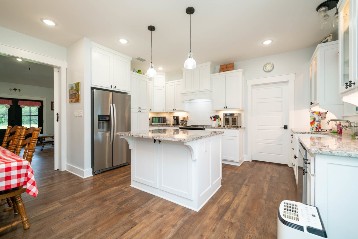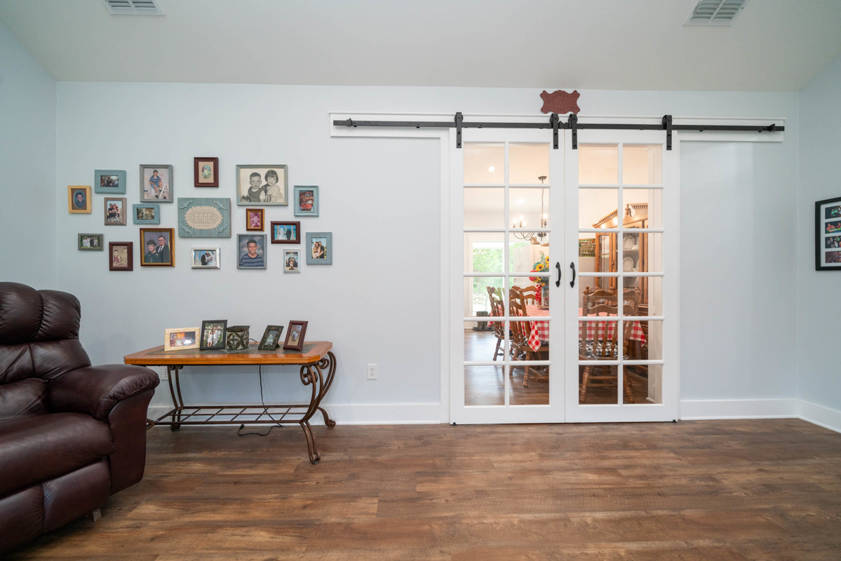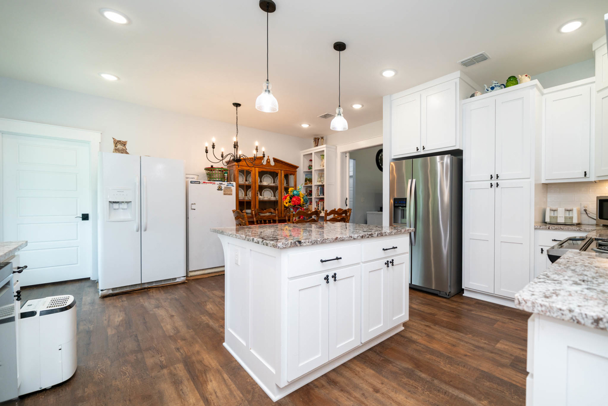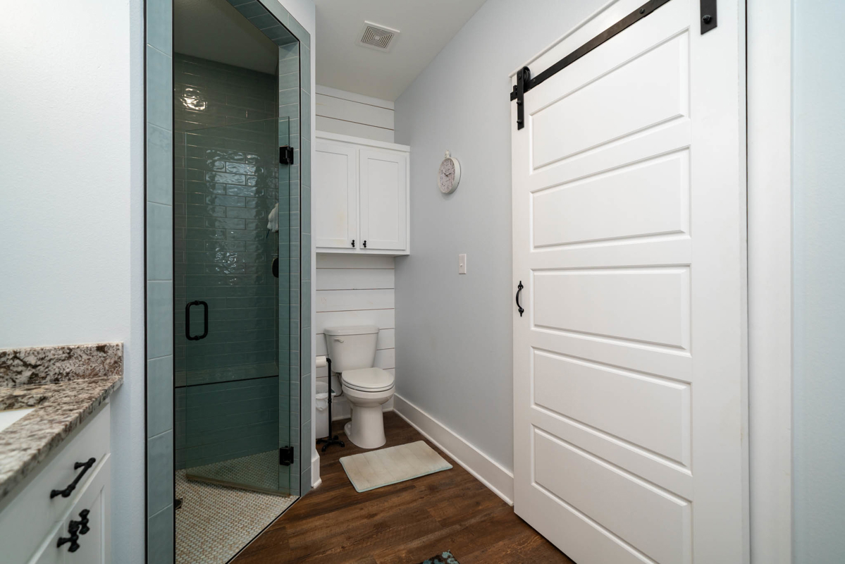 The thoughtfully designed split floor plan offers privacy for the spacious master suite, which features double sinks, beautifully tiled shower, a generous closet with an additional space for storage. All bedrooms include ample closet space, with one ideally suited as a home office. At the heart of the home lies a dream kitchen ,complete with an extra-large walk-in pantry, recessed shelving in the cabinets, under-counter island storage, and specialized storage about the fridge for cookie sheets or cutting boards, etc. Bright and airy, the living room boasts tall, vaulted ceilings and stylish sliding glass barn doors that lead to the kitchen and dining area. One added bonus to the home is an outdoor connection for a portable generator.