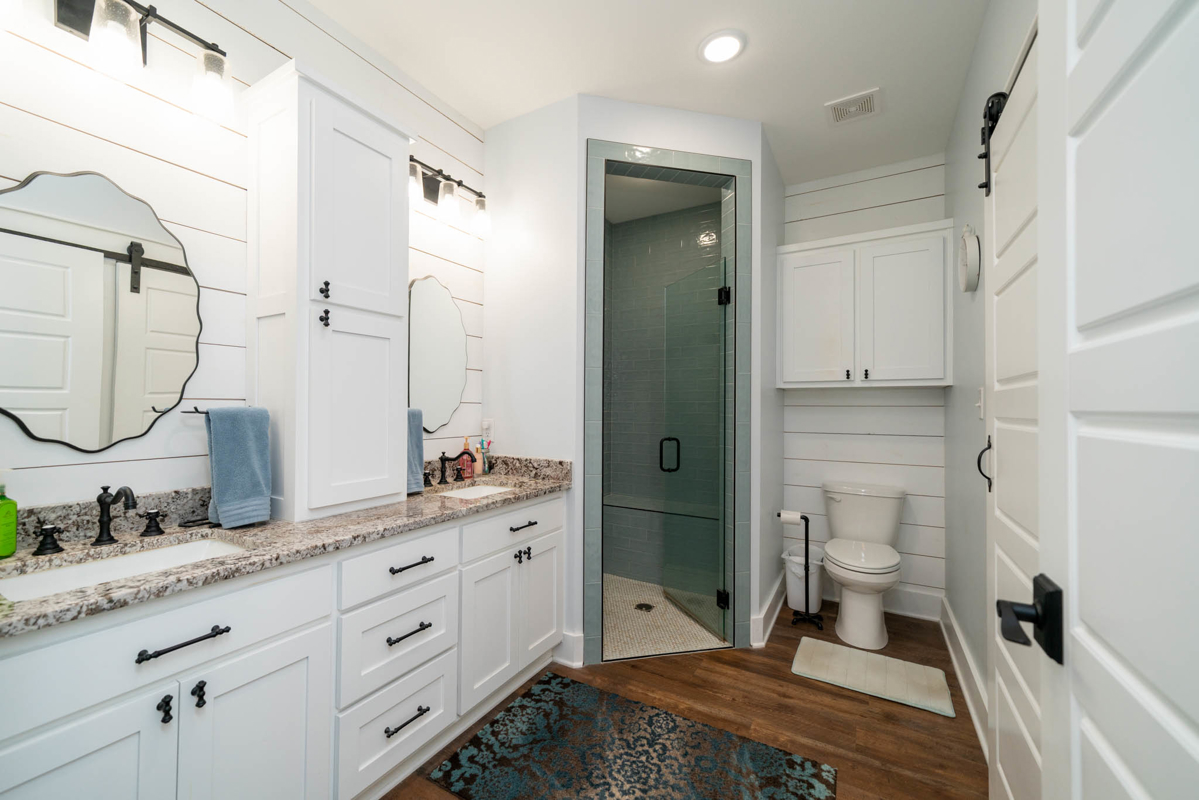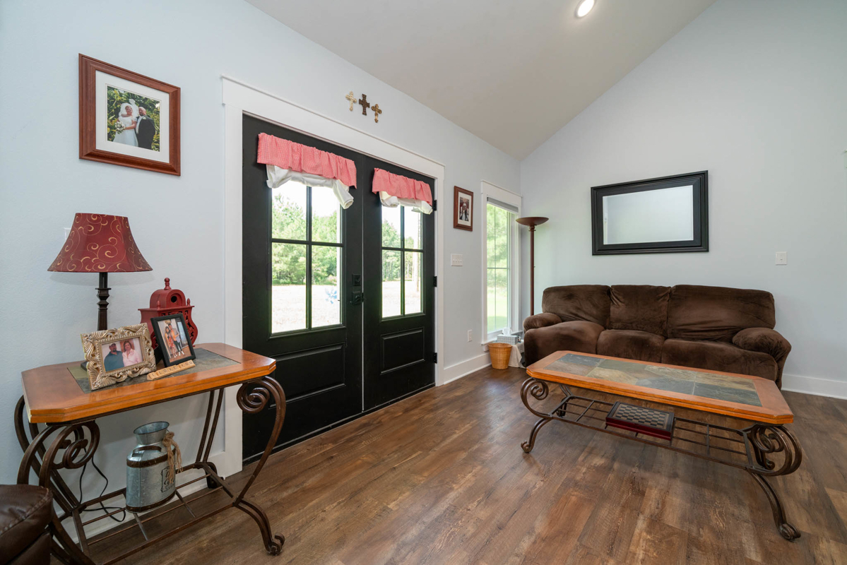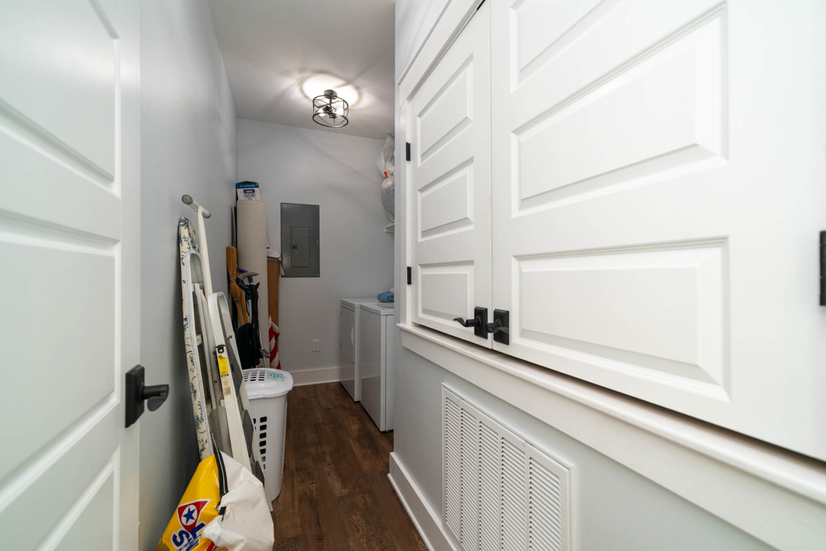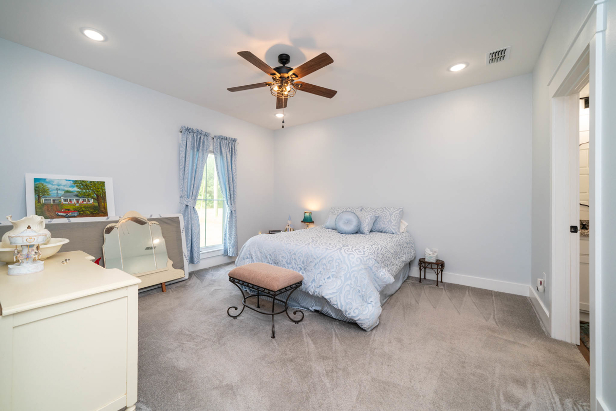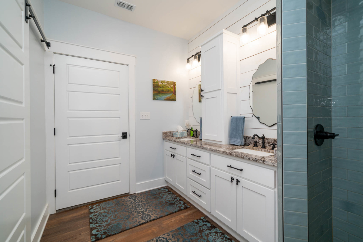 The thoughtfully designed split floor plan offers privacy for the spacious master suite, which features double sinks, beautifully tiled shower, a generous closet with an additional space for storage. All bedrooms include ample closet space, with one ideally suited as a home office. At the heart of the home lies a dream kitchen ,complete with an extra-large walk-in pantry, recessed shelving in the cabinets, under-counter island storage, and specialized storage about the fridge for cookie sheets or cutting boards, etc. Bright and airy, the living room boasts tall, vaulted ceilings and stylish sliding glass barn doors that lead to the kitchen and dining area. One added bonus to the home is an outdoor connection for a portable generator.