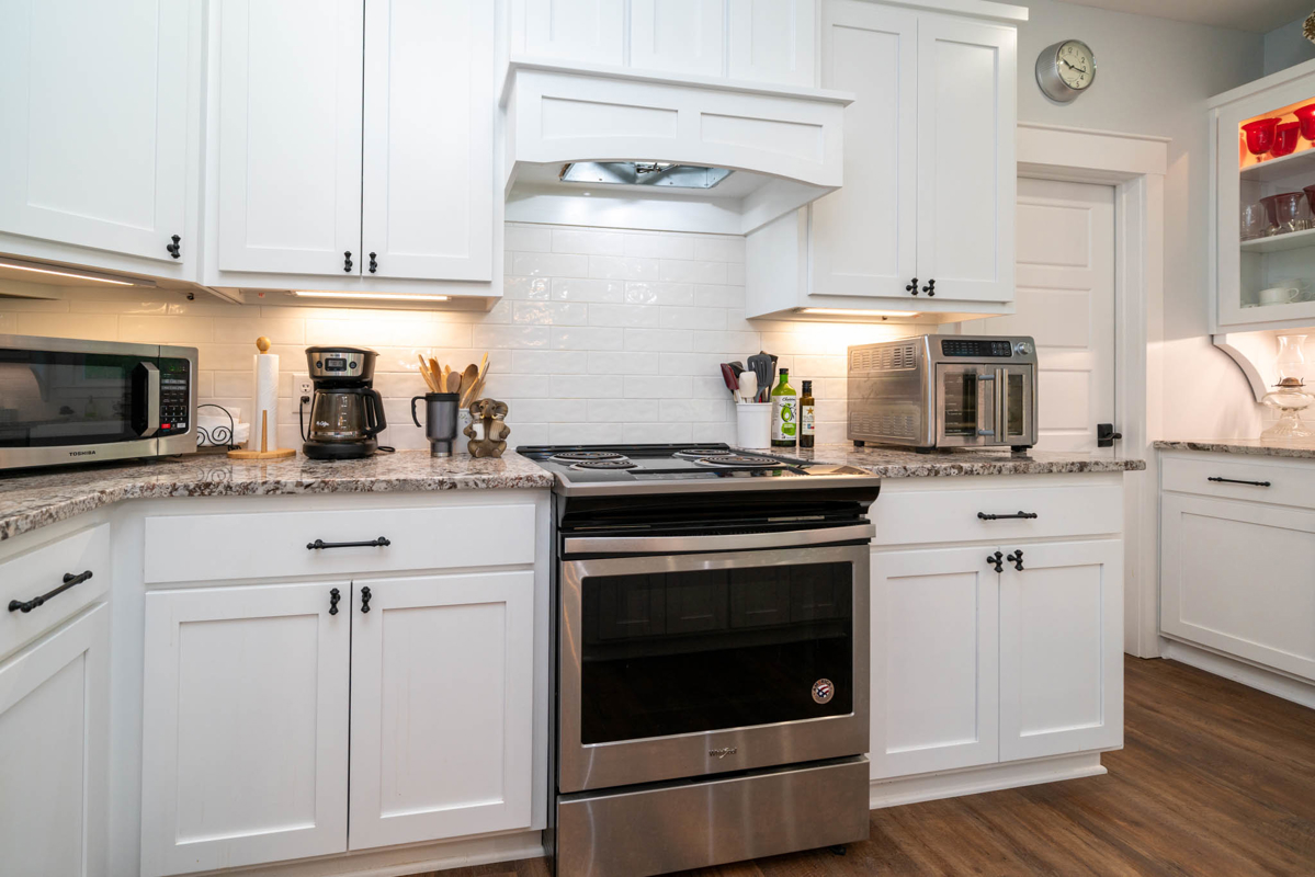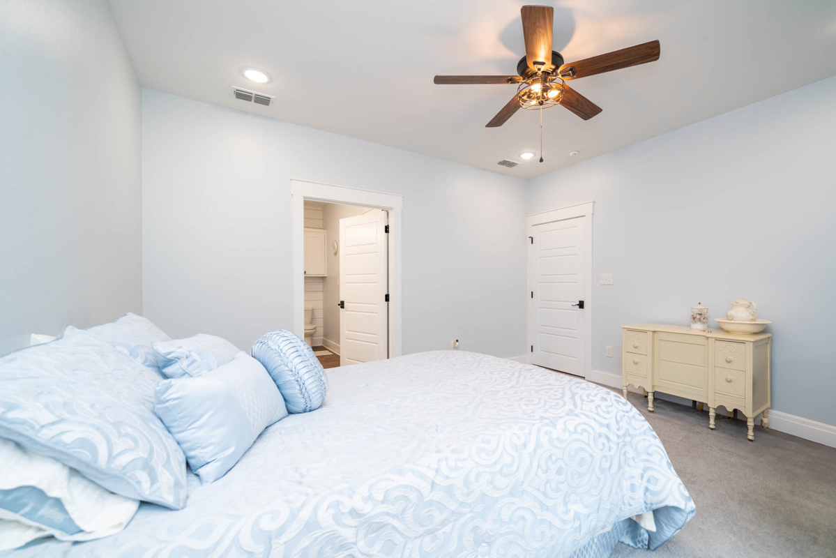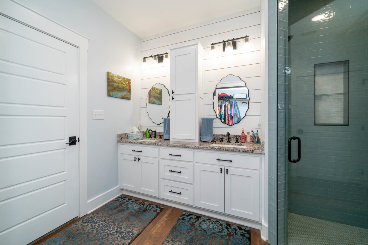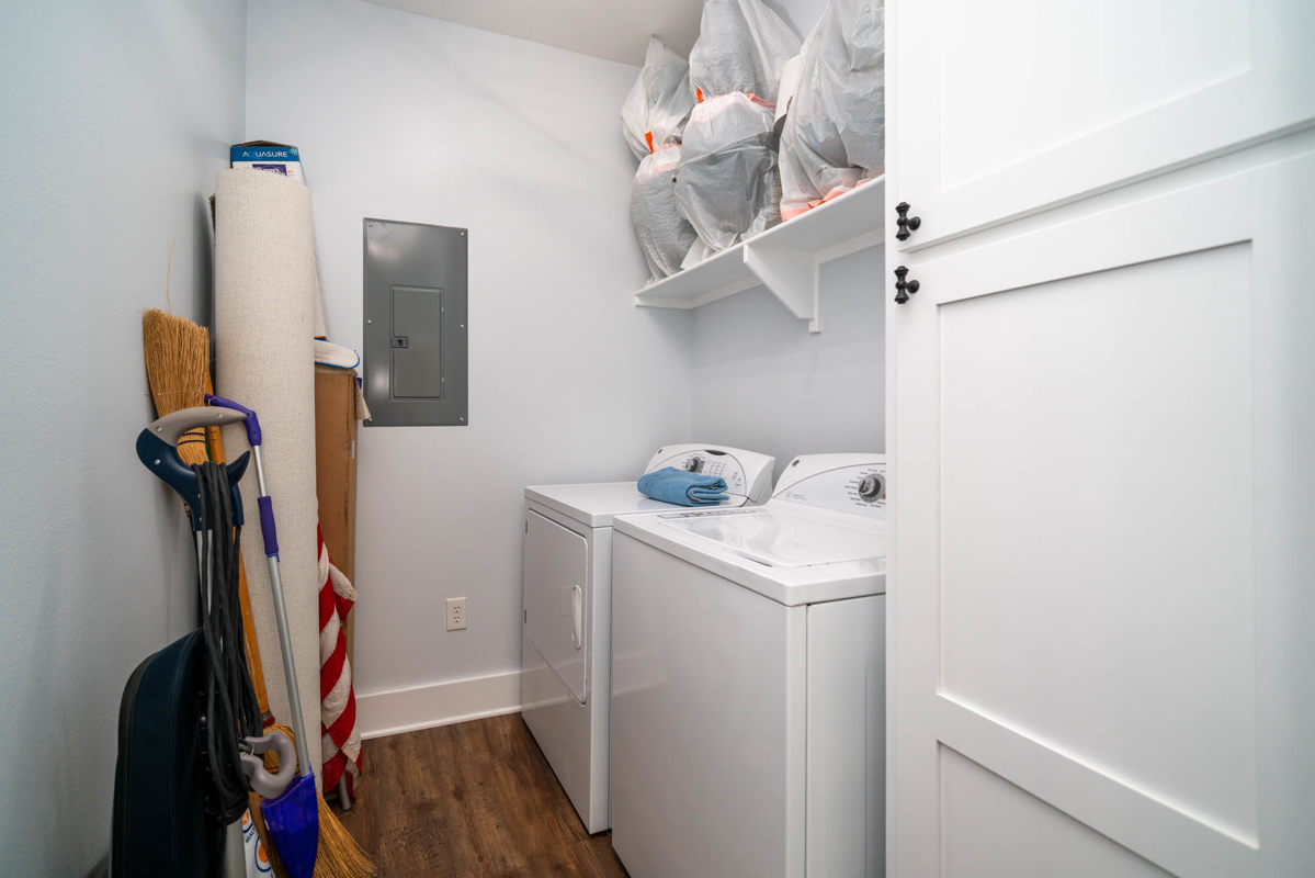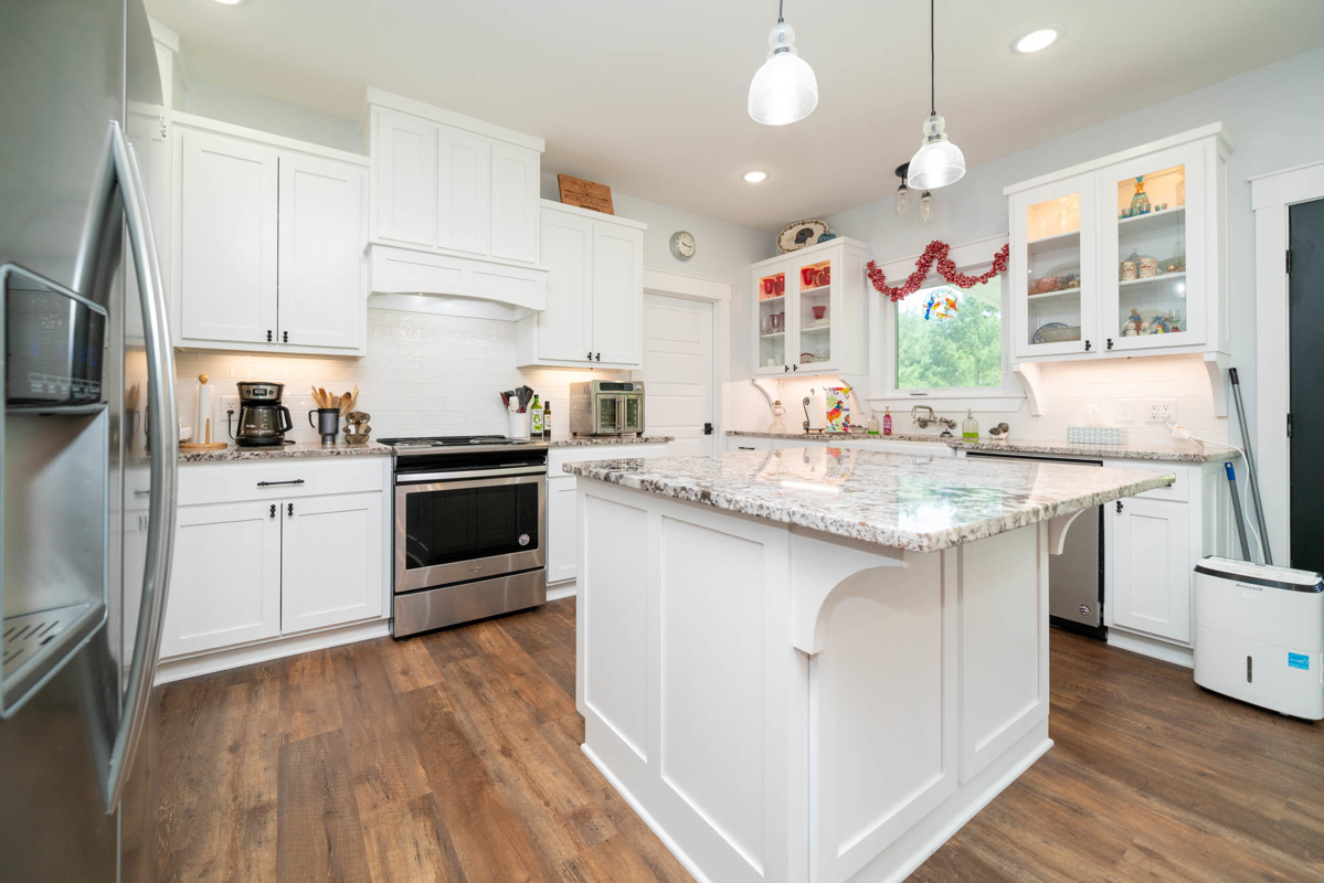 The thoughtfully designed split floor plan offers privacy for the spacious master suite, which features double sinks, beautifully tiled shower, a generous closet with an additional space for storage. All bedrooms include ample closet space, with one ideally suited as a home office. At the heart of the home lies a dream kitchen ,complete with an extra-large walk-in pantry, recessed shelving in the cabinets, under-counter island storage, and specialized storage about the fridge for cookie sheets or cutting boards, etc. Bright and airy, the living room boasts tall, vaulted ceilings and stylish sliding glass barn doors that lead to the kitchen and dining area. One added bonus to the home is an outdoor connection for a portable generator.