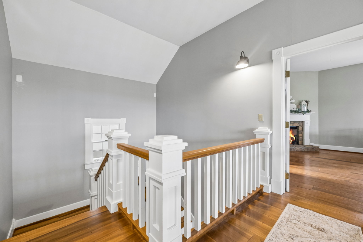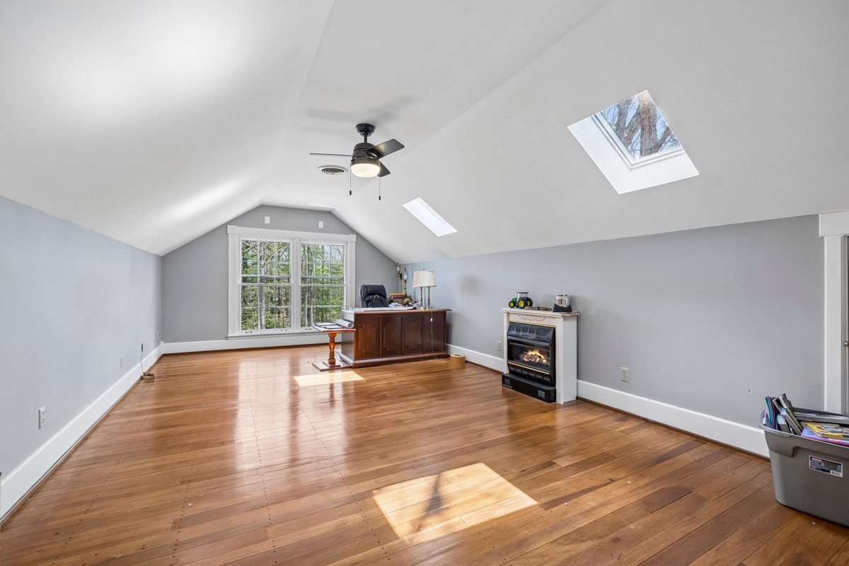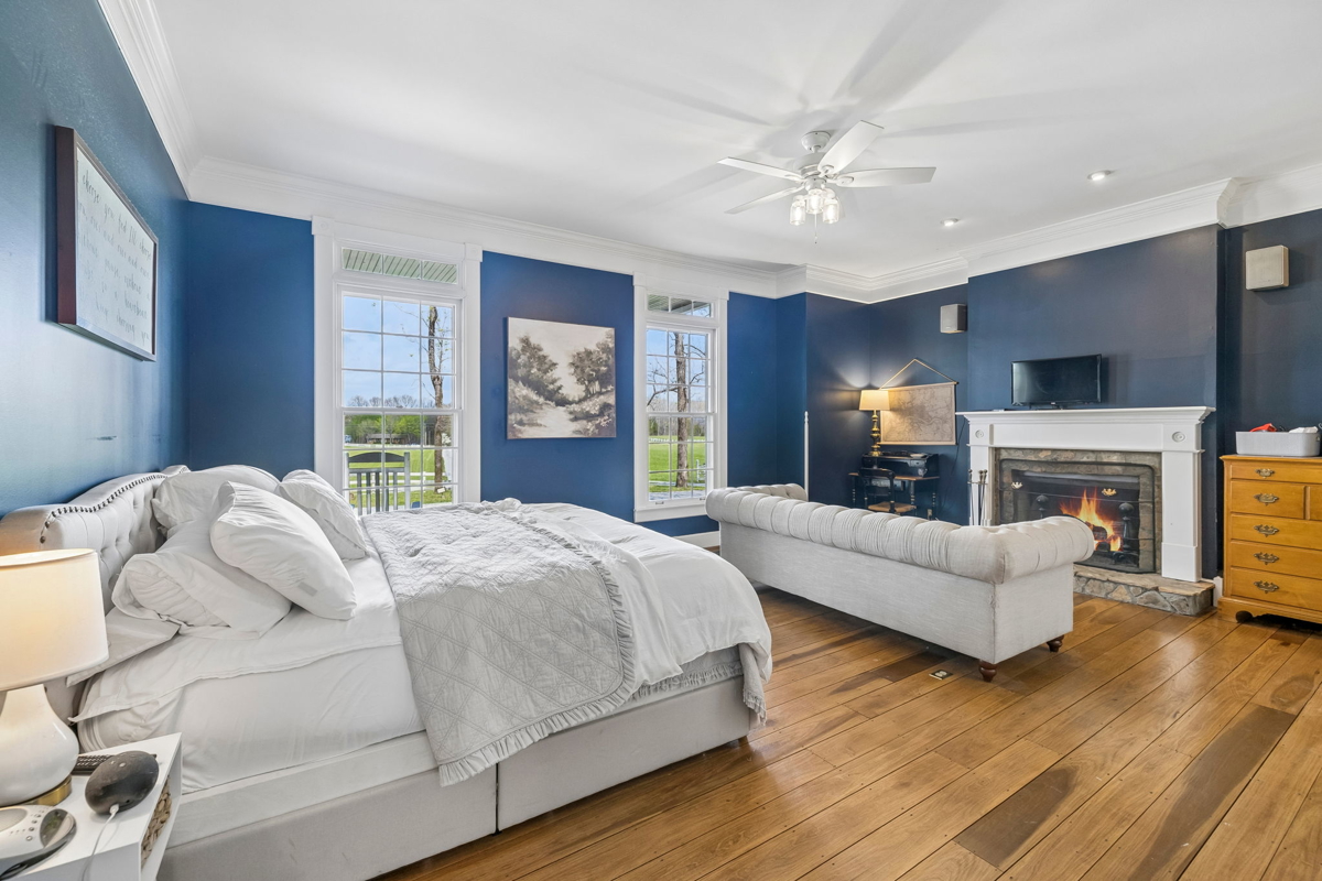 Tucked behind a long private driveway, the traditional farmhouse-style main residence overlooks rolling pastures, mature hardwoods, and picturesque countryside views. Offering approximately 3,900 square feet of living space, the home features expansive double porches, multiple fireplaces, and generous living areas designed to capture the natural beauty of the surrounding landscape.