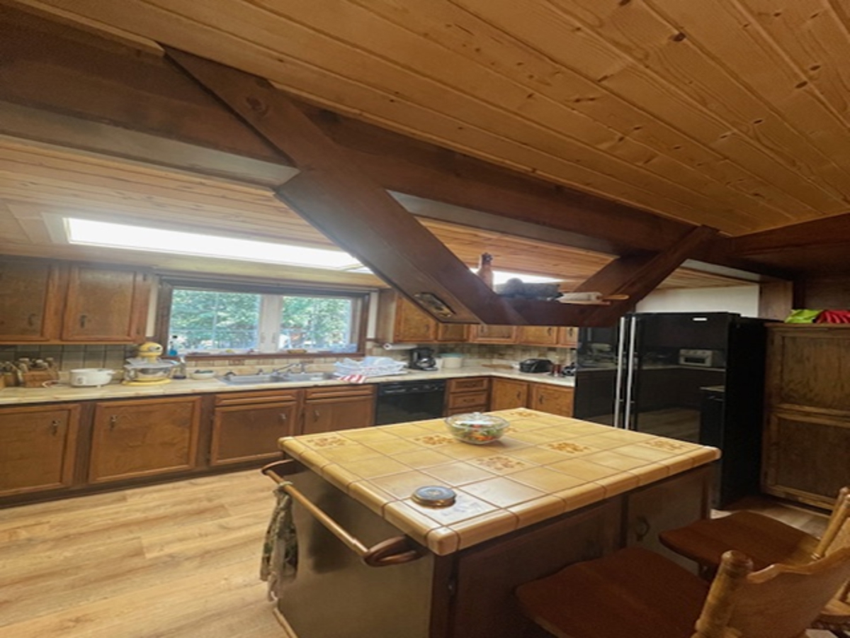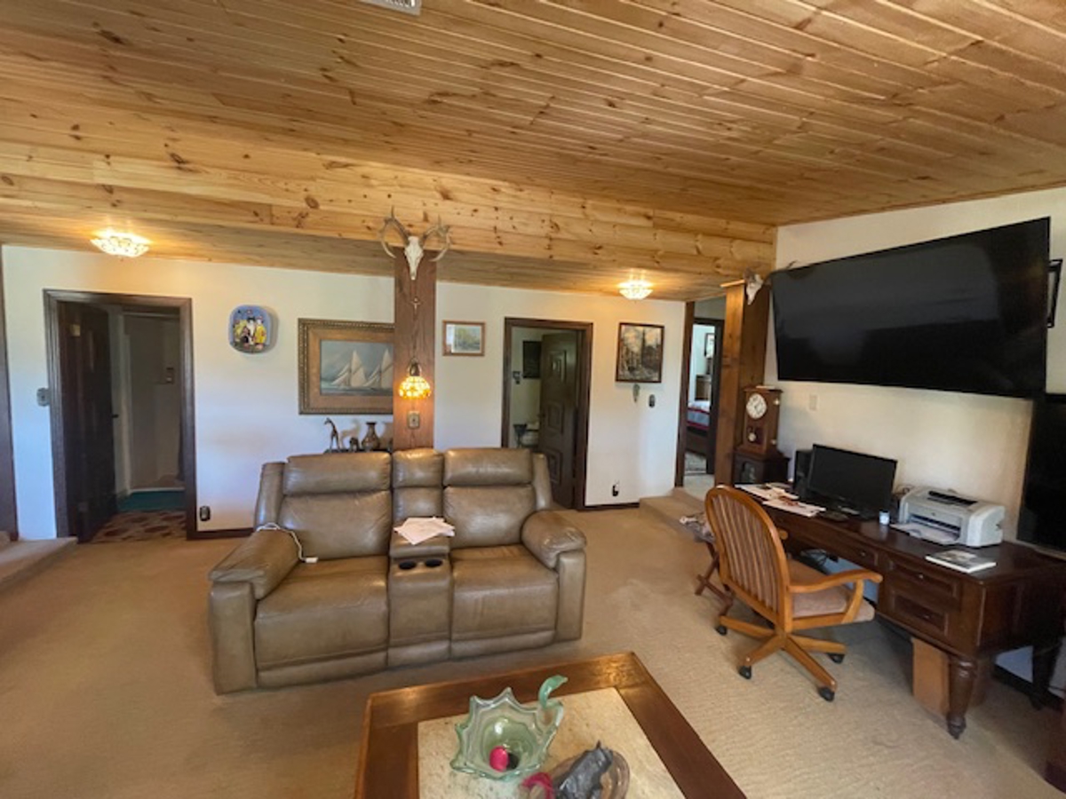wood ceiling in the living room/dining room/kitchen areas which are open to
