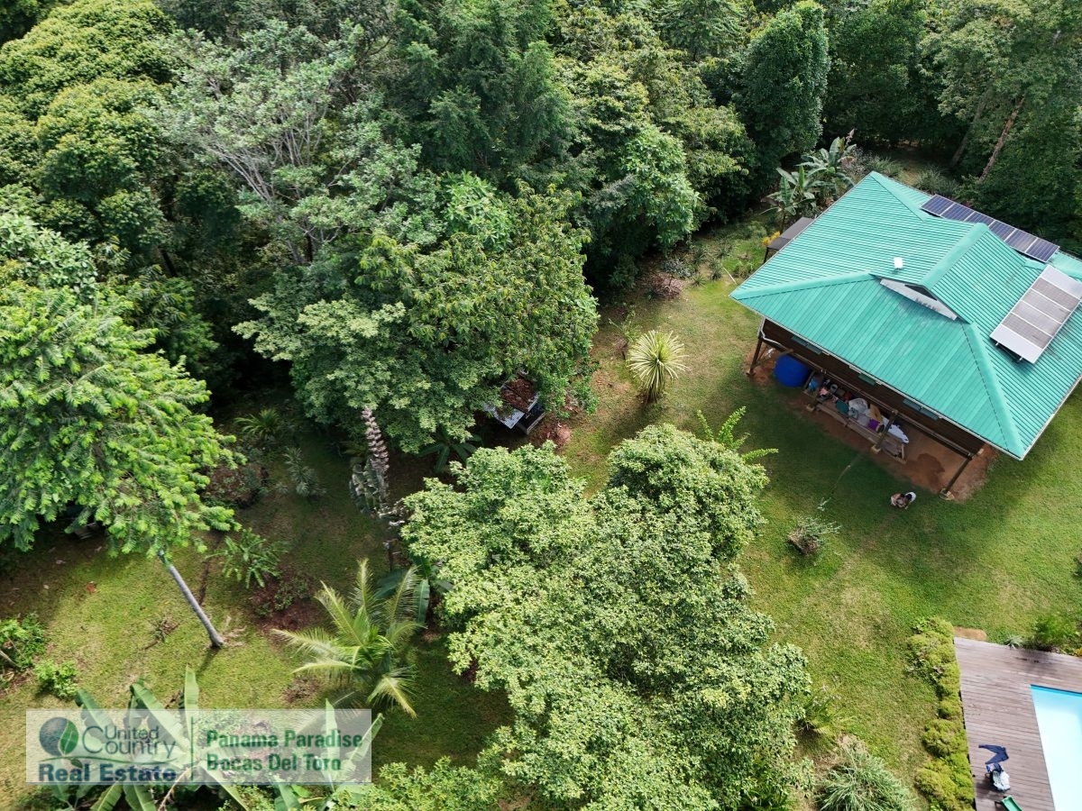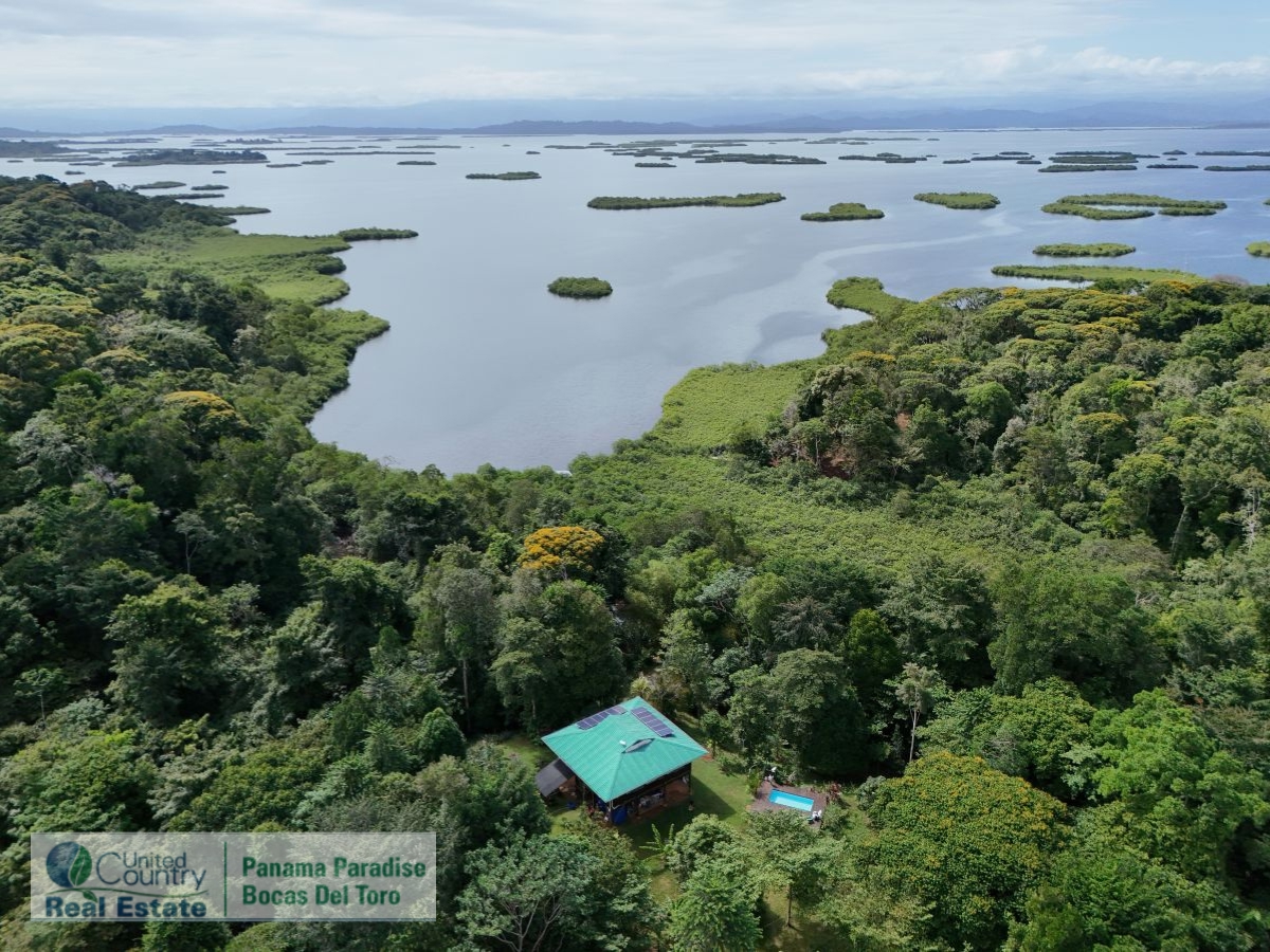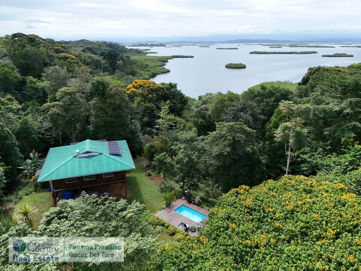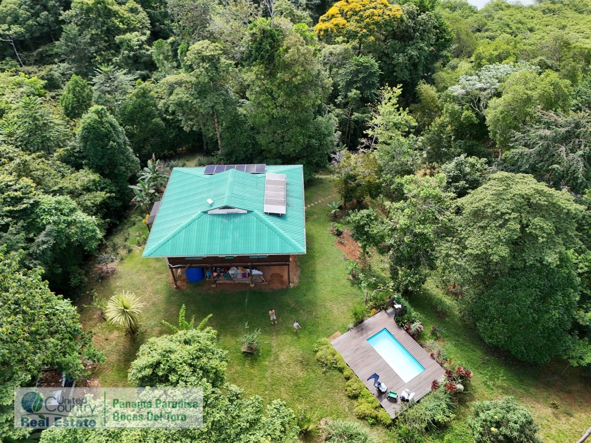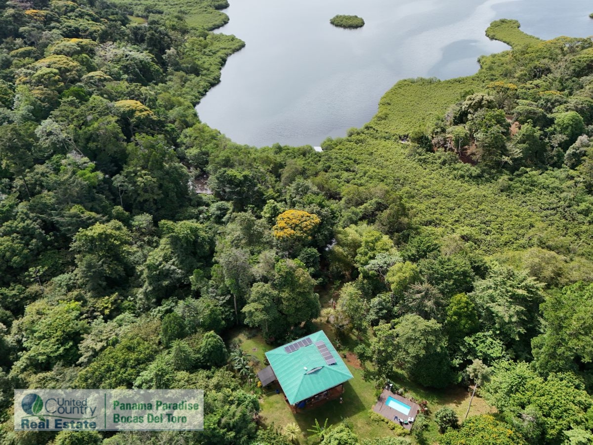 Sustainable Off-Grid Retreat in Tropical Panama ParadiseJust 15 to 20 minutes by boat from the activity of Bocas Town, this unique property offers peace, privacy, and potential — all tucked away in a quiet, protected bay. Known as Loma Nuci on Bastimento Island, the property is surrounded by lush jungle and sits just minutes from popular spots like “The Cut” expat community and Red Frog Beach. There is safe anchorage in front of the property, and you can arrive at your own private boathouse, cross a natural mangrove tunnel, and take a short walk up to the hill. At the top, the two-story home sits high in the trees, offering beautiful views and a deep connection to nature. The lower level includes a bodega for storage or future expansion. Upstairs is the main living space — an open-plan kitchen and living area that opens out onto a large terrace. From here, you can spot dolphins in the bay or even see Volcán Barú on a clear day. The home has two bedrooms, a living room, and one bathroom. One of the bedrooms and the bathroom could use some updates, giving you a chance to put your own stamp on the place. There’s also an outdoor shower, perfect after a swim or hike.The property includes a private pool with a large sun deck, all surrounded by tropical plants. The land itself is full of fruit trees, flowers, and even a chicken house — great for anyone interested in sustainable living. There’s also a small plant nursery on site, offering a head start for any gardening or reforestation projects. Birdwatchers will love the incredible variety of species that visit the property, thanks to its proximity to the adjacent national park. The home and surrounding land together encompass a total of 11.5 acres of undeveloped jungle with scenic walking trails, offering endless opportunities to explore, expand, or simply enjoy nature at its best.
